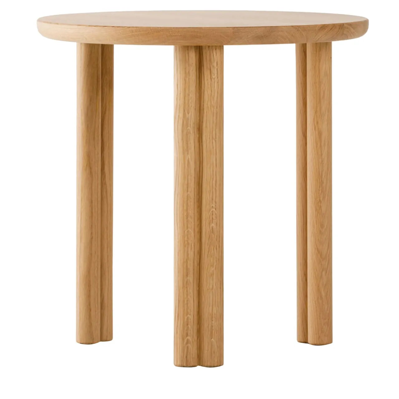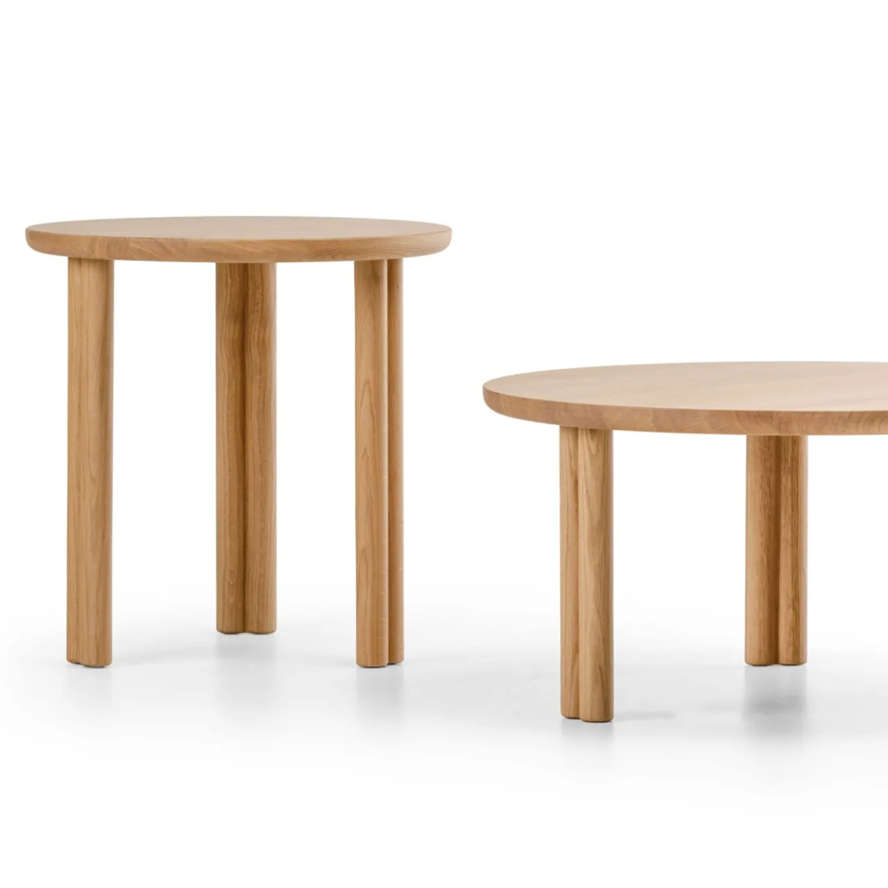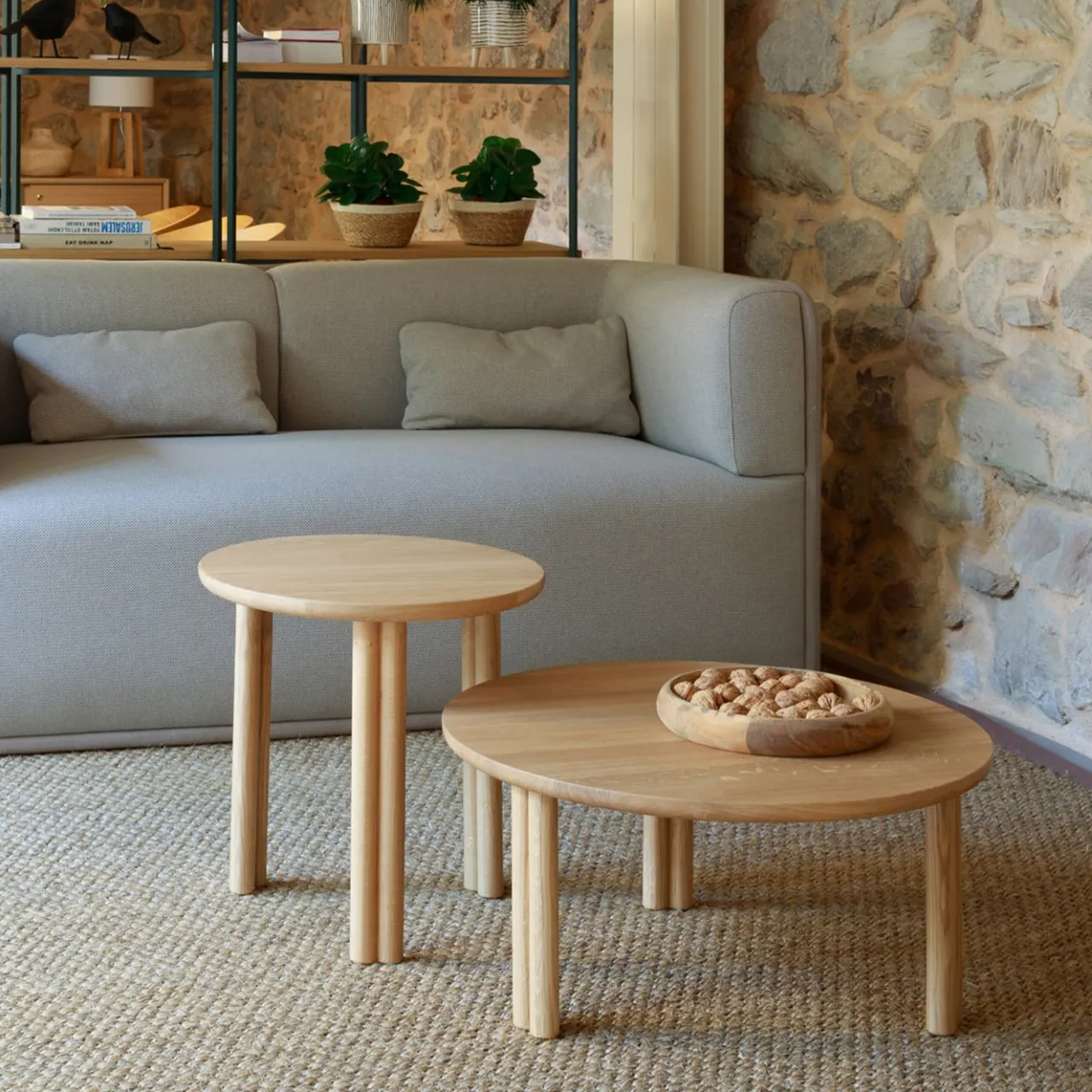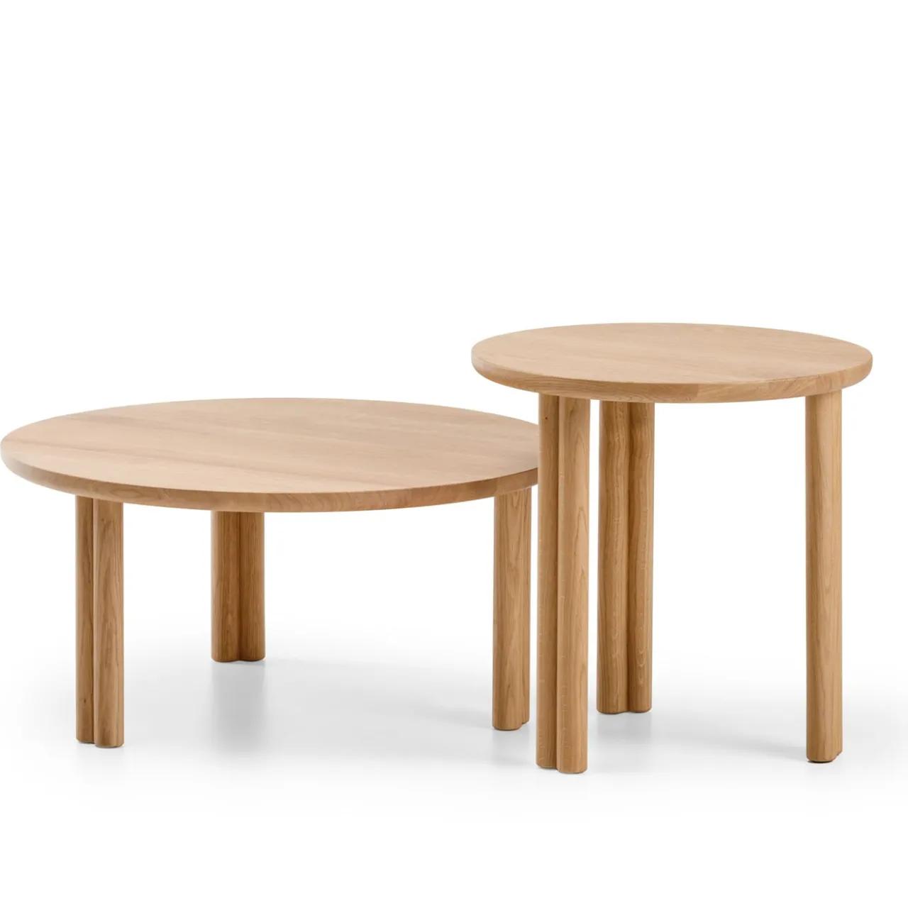 Idealmente abbinato al suo gemello più basso e più largo per un insieme coerente che massimizza lo spazio per vassoi o oggetti decorativi, questo tavolino permette di apprezzare le venature naturali del legno mantenendo una silhouette elegante. Tre gambe in rovere pregiato, composte da una coppia di elementi in legno, sostengono il piano circolare del tavolo. Il design è inoltre dotato di piastre di collegamento in acciaio.