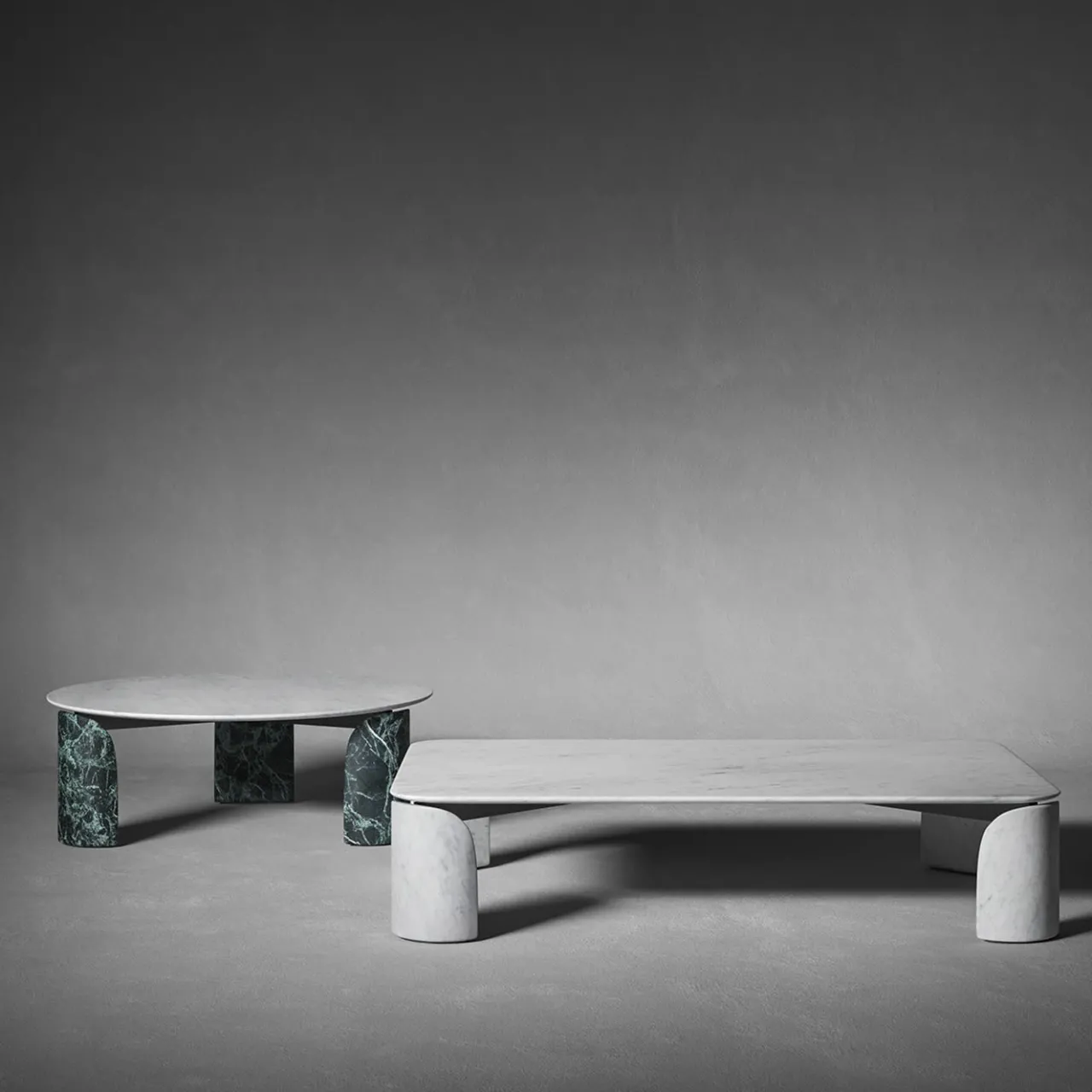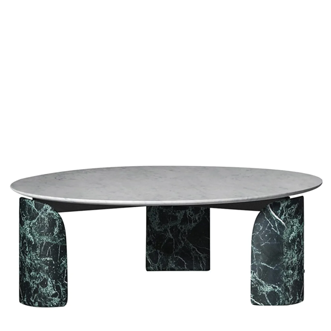 Una combinazione di marmi pregiati e curve accattivanti definisce il carattere esclusivo di questo tavolino, una soluzione eccellente per servire tè, caffè o rinfreschi su una lussuosa tela naturale. Segnate da intense trame che emergono dal fondo verde intenso, le tre gambe ricurve in marmo Verde Alpi sostengono i montanti su cui poggia il piano circolare in marmo bianco brillante di Carrara. È disponibile anche una versione in pietra d’Avola.
