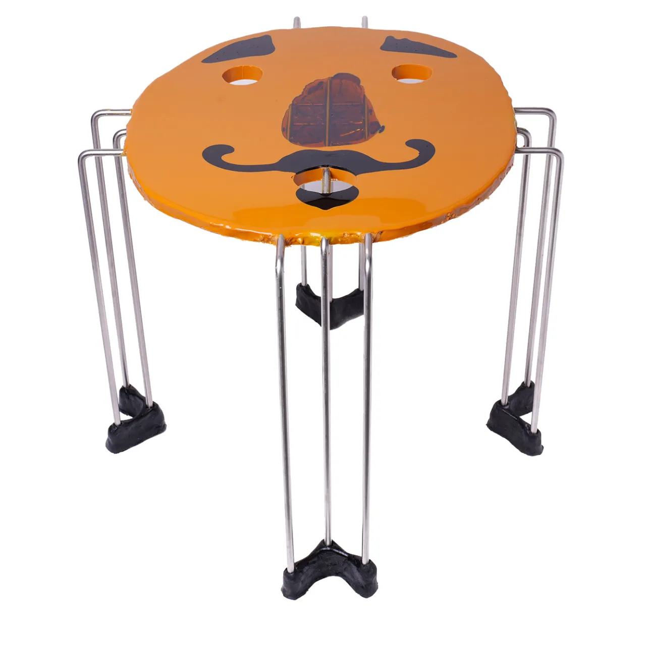 Un tavolino progettato da Gaetano Pesce con un piano circolare in ocra opaco decorato con grafiche facciali giocose. Il tavolo è sorretto da una distintiva struttura metallica con cappucci neri sulle gambe. Parte della collezione Fish Design, questo pezzo sorprendente combina forma funzionale ed espressione artistica, adatto come tavolino da lato o da caffè in interni contemporanei.