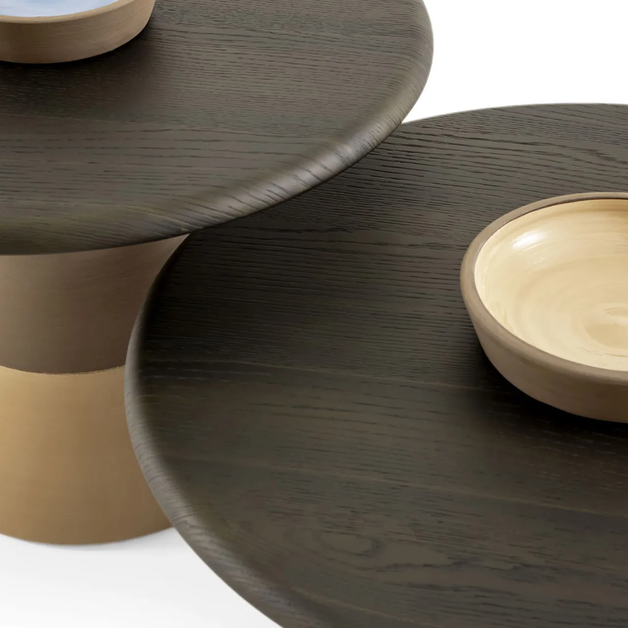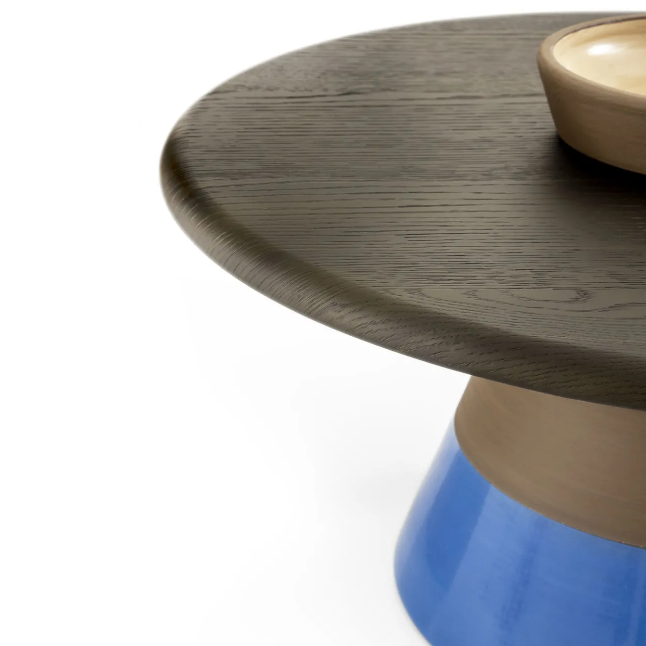 Un’ode all’artigianato, questo tavolino presenta una base in terracotta naturale scura, sapientemente tornita al tornio, ornata da un inserto in smalto azzurro lucido. Il piano del tavolo, realizzato in MDF impiallacciato in rovere Laguna con finitura stampata a membrana, si armonizza perfettamente con la base in terra. Un vano portaoggetti in terracotta, smaltato internamente in tortora lucido, aggiunge un’eleganza pratica a questo pezzo, rendendolo un’aggiunta accattivante a qualsiasi ambiente del soggiorno.