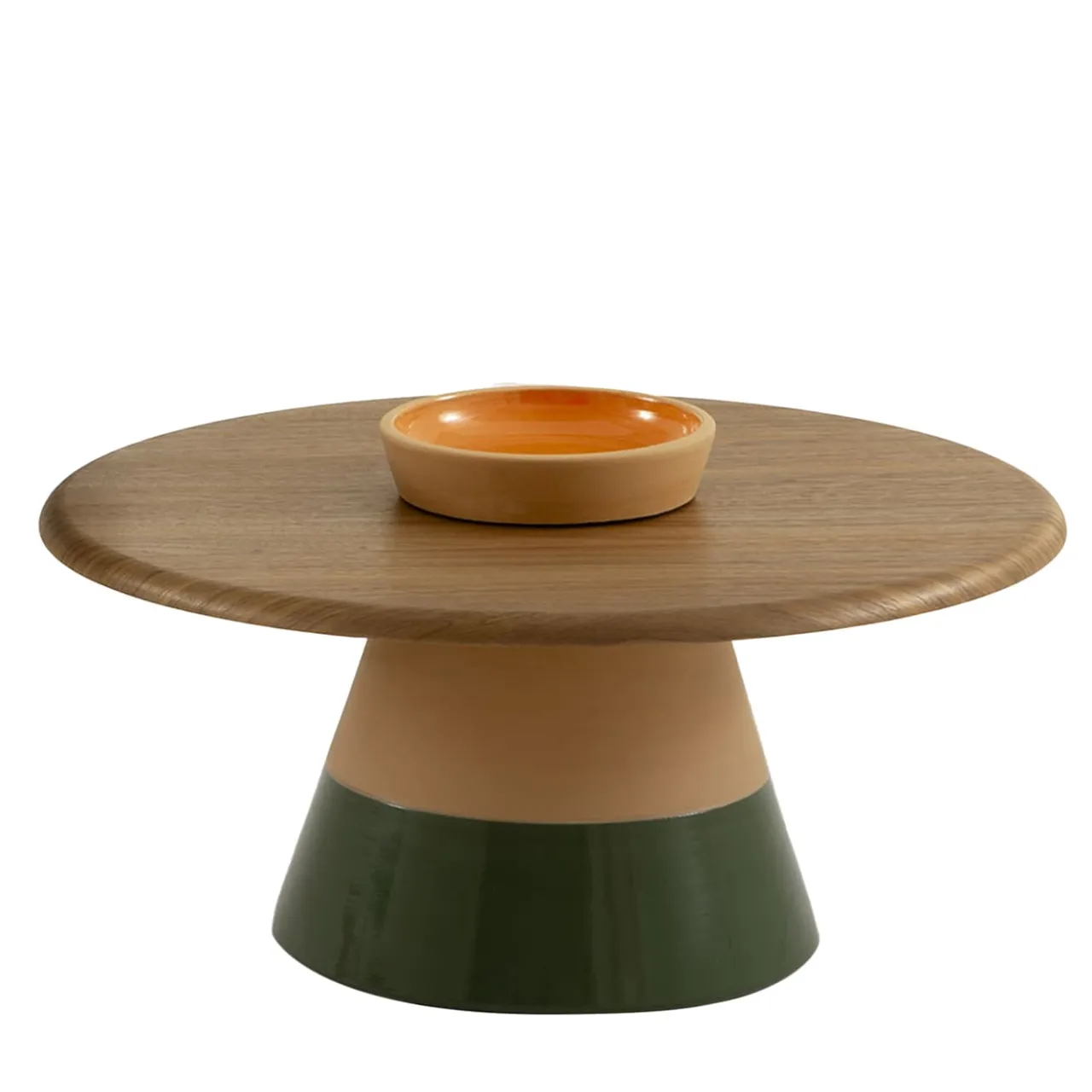 Realizzato in terracotta naturale, modellata con precisione al tornio, questo tavolino da salotto è impreziosito da un inserto in smalto lucido color arancio mandarino. Il piano del tavolo è in MDF impiallacciato noce canaletto, sapientemente rifinito con pressatura a membrana per un look raffinato. Un vano portaoggetti in terracotta, smaltato internamente in un brillante verde muschio, aggiunge bellezza funzionale a questo capolavoro artigianale, rendendolo un’aggiunta sorprendente a qualsiasi spazio abitativo moderno.