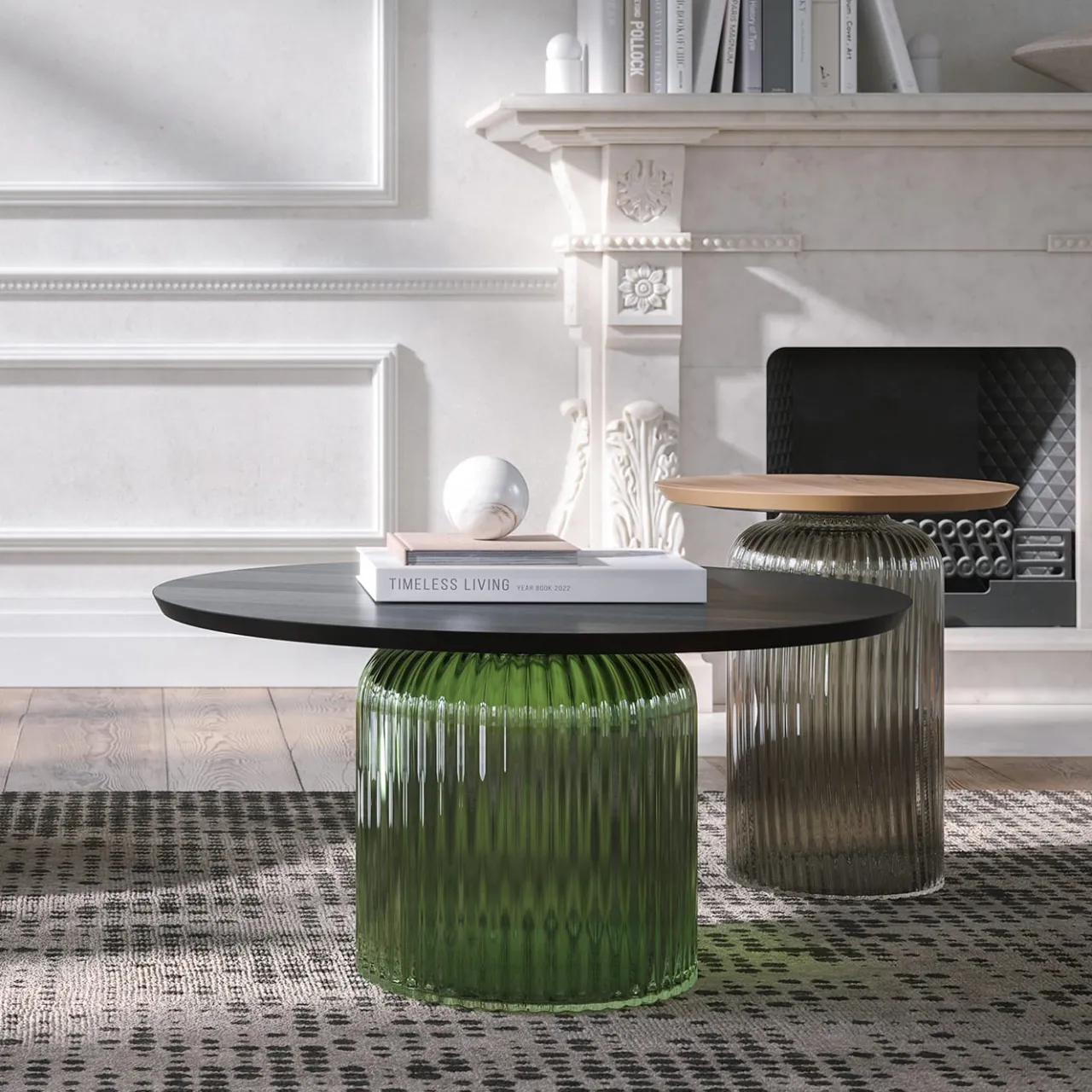 Soffio è un elegante tavolino in vetro veneziano soffiato a bocca, caratterizzato da un raffinato effetto di superficie plissettata in verde oliva. Impreziosito da un piano rotondo con bordi smussati, rifinito in frassino nero, unisce la maestria artigianale alla raffinatezza contemporanea, aggiungendo un tocco di eleganza senza tempo a qualsiasi spazio.