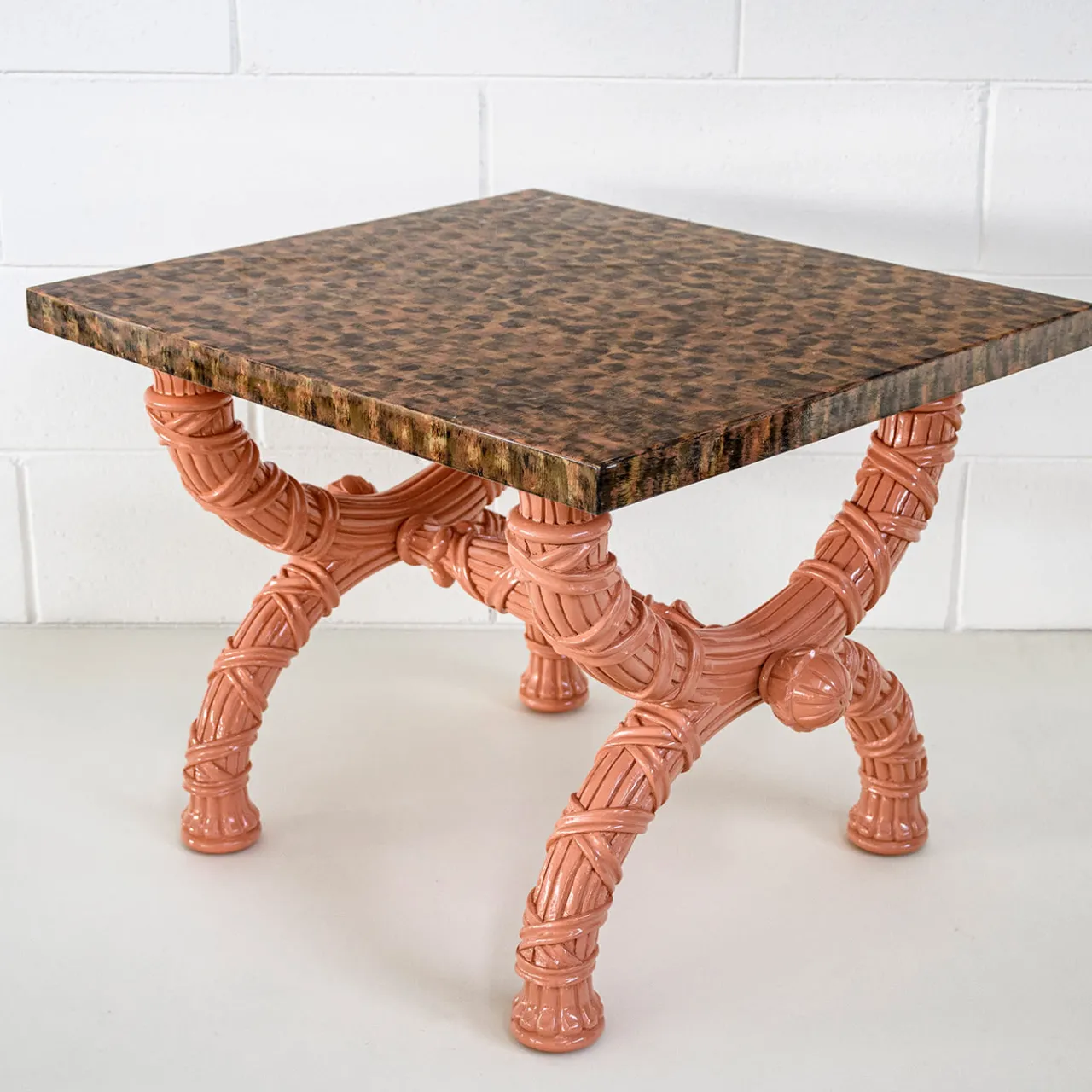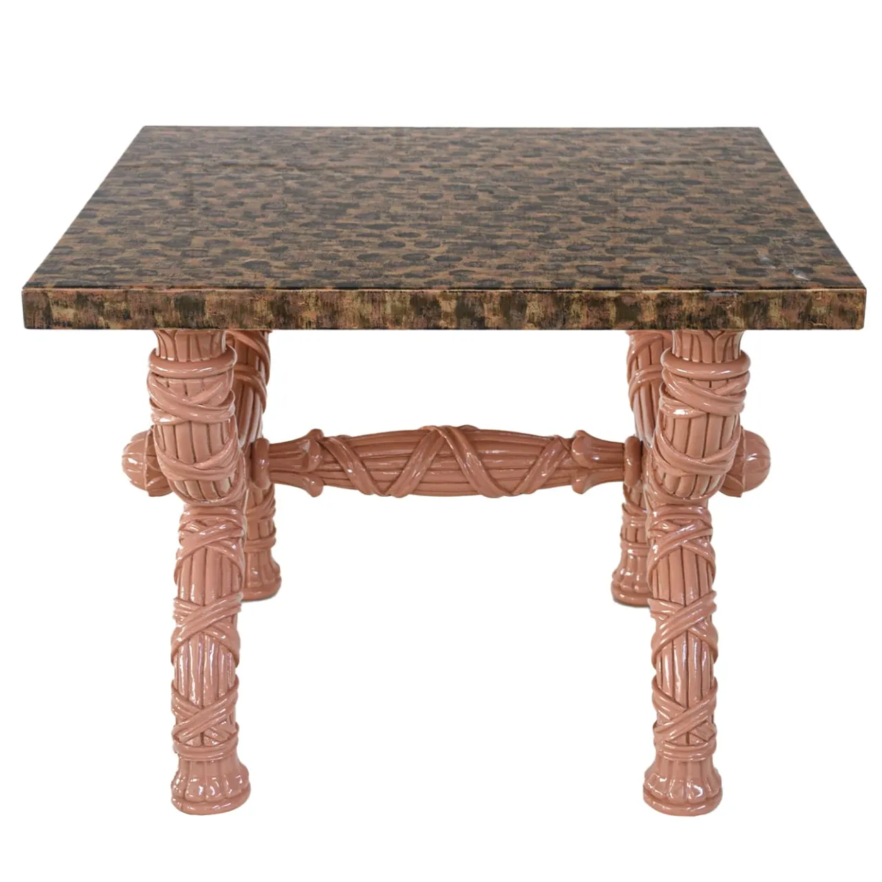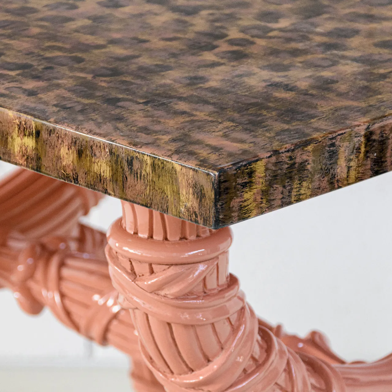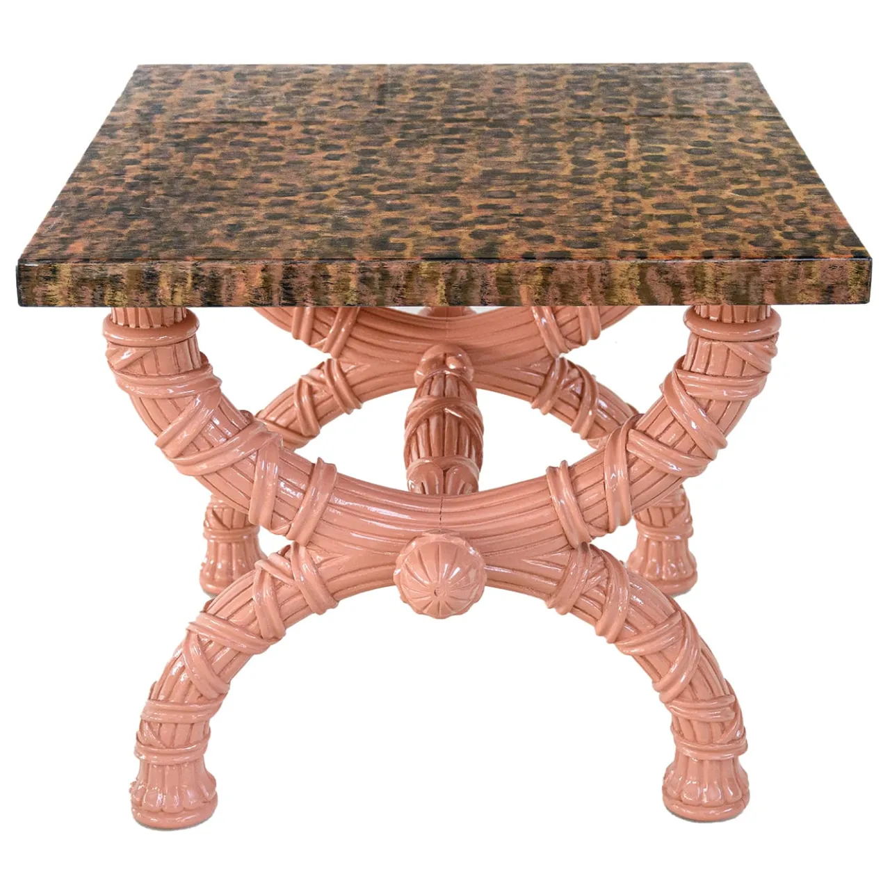 Tavolino con base in legno intagliato, laccato rosa. Il piano è in legno dipinto a mano con finitura lucida. Un tocco di colore gioioso per illuminare ogni ambiente! Questo tavolino è un pezzo unico disegnato da G. Ventura.