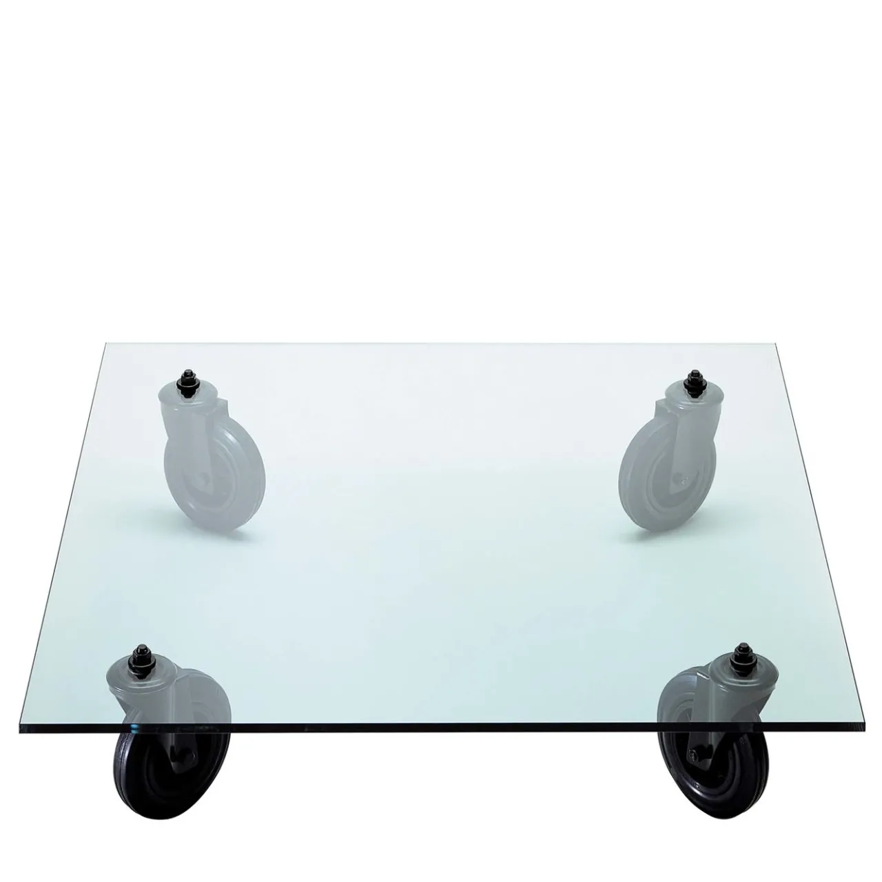 Quando era direttore artistico di FontanaArte, Gae Aulenti si è ispirata al carrello industriale utilizzato per trasportare i pannelli di vetro nei laboratori. Il design anticonvenzionale di questo tavolino è nato dalla combinazione di un piano in vetro spesso 15 mm, sostenuto da quattro ruote corte, e di una struttura in metallo rifinita in nero. È disponibile in sette diverse dimensioni che combinano piani quadrati e rettangolari. Per le opzioni, consultare il Concierge.