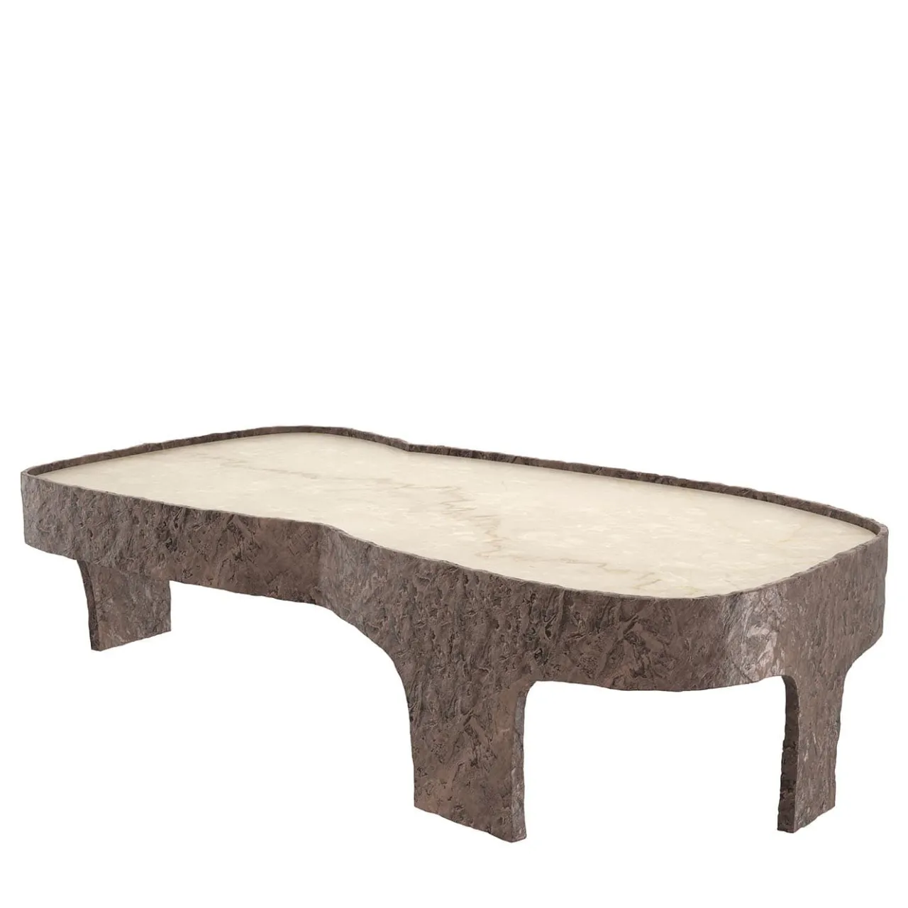Sumatra V3 è un tavolino del XXI secolo realizzato da artigiani italiani in bronzo fuso con patina marrone chiaro con uno straordinario piano in marmo Botticino Classico. Fa parte del linguaggio del design da collezione Sumatra, sviluppato dal team di ricerca artistica di Edizione Limitata a Milano. L’oggetto fonda la sua eleganza nel contrasto tra la levigatezza della pietra e la texture materica del corpo in alluminio. Edizione limitata di 15 + 3 AP.