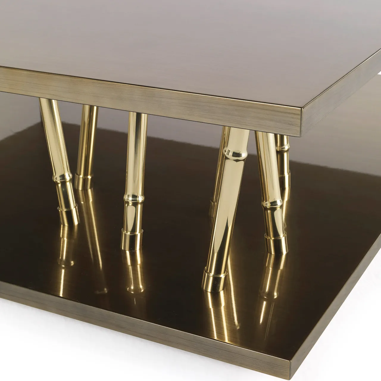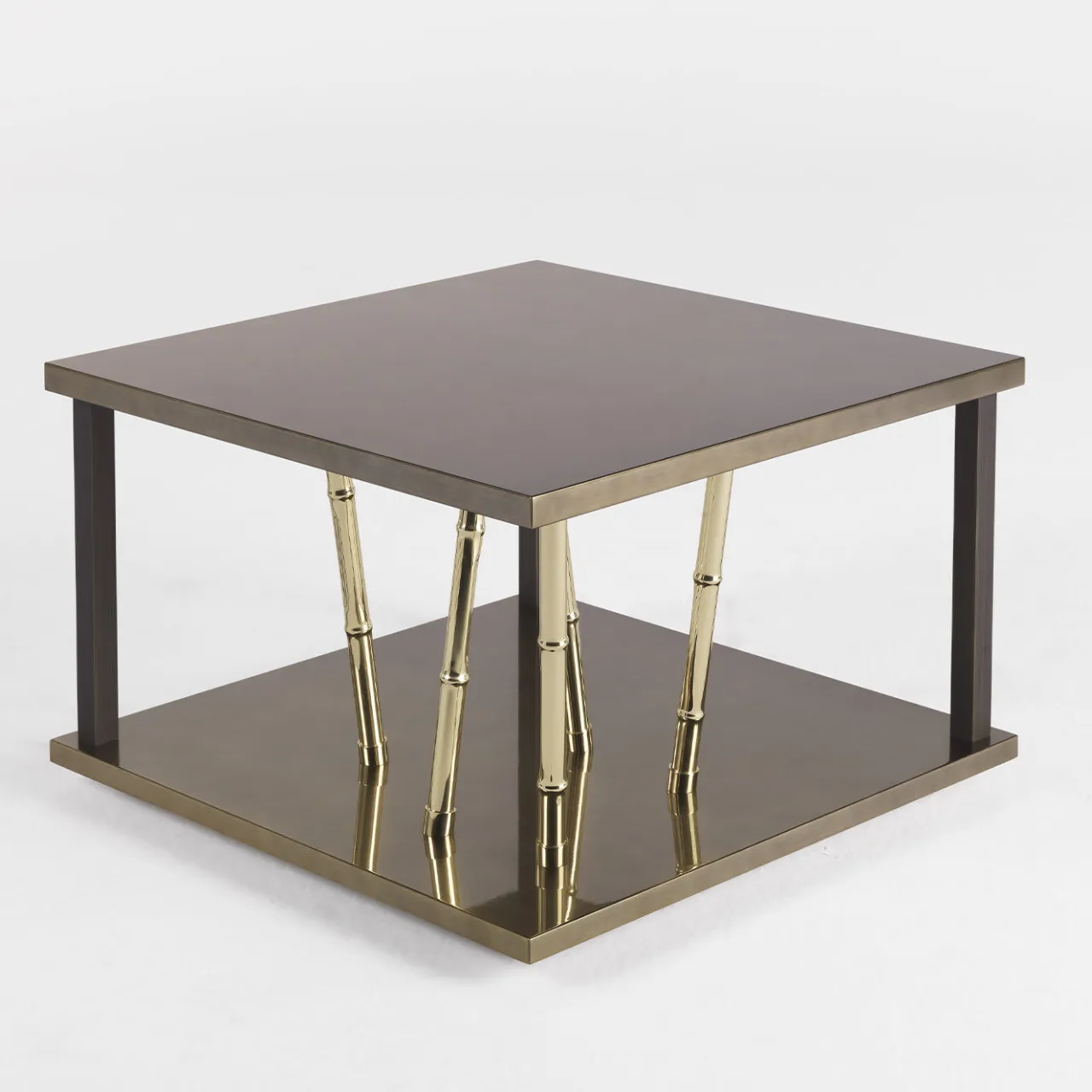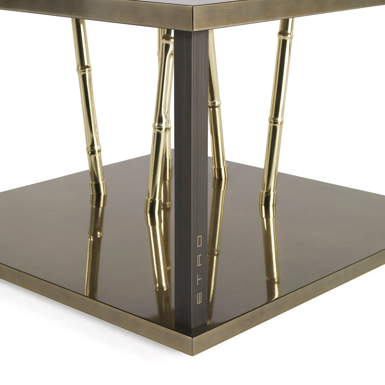 L’evoluzione della linea Taxila, introdotta nel 2018. La canna di bambù, elemento evocativo di ispirazione naturalistica, è protagonista della collezione e proposta con una finitura in ottone lucido, un richiamo all’etnico che incontra la raffinatezza di materiali preziosi, dando vita a un’insolita combinazione di elementi. Il piano del tavolo è in legno laccato in metallo liquido patinato oro, un materiale innovativo per un effetto insolito e raffinato. Struttura in metallo bronzo patinato con piano e base in legno laccato oro liquido patinato. Elementi a forma di bambù in ottone lucido. Contattare il Concierge per altre varianti disponibili.