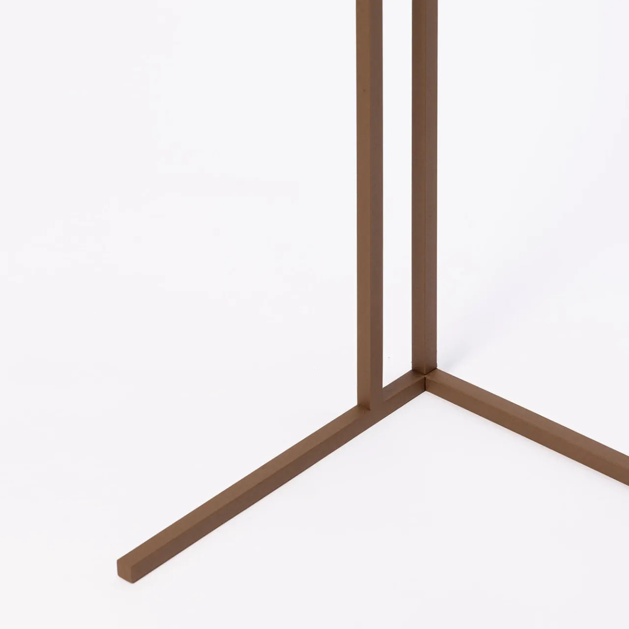 Il tavolino Thabit in acciaio combina solidità ed eleganza con un design che enfatizza la durabilità e la permanenza. La sua base stilizzata a forma di C e i quattro supporti verticali agli angoli creano una forma geometrica precisa. A differenza del suo omologo, mantiene un sottile spazio quando accostato al divano, trasformando funzione in gesto estetico. Il piano rettangolare con bordi arrotondati offre la superficie perfetta per appoggiare un laptop, un libro o una tazza. Progettato da Svetlana Golubeva.