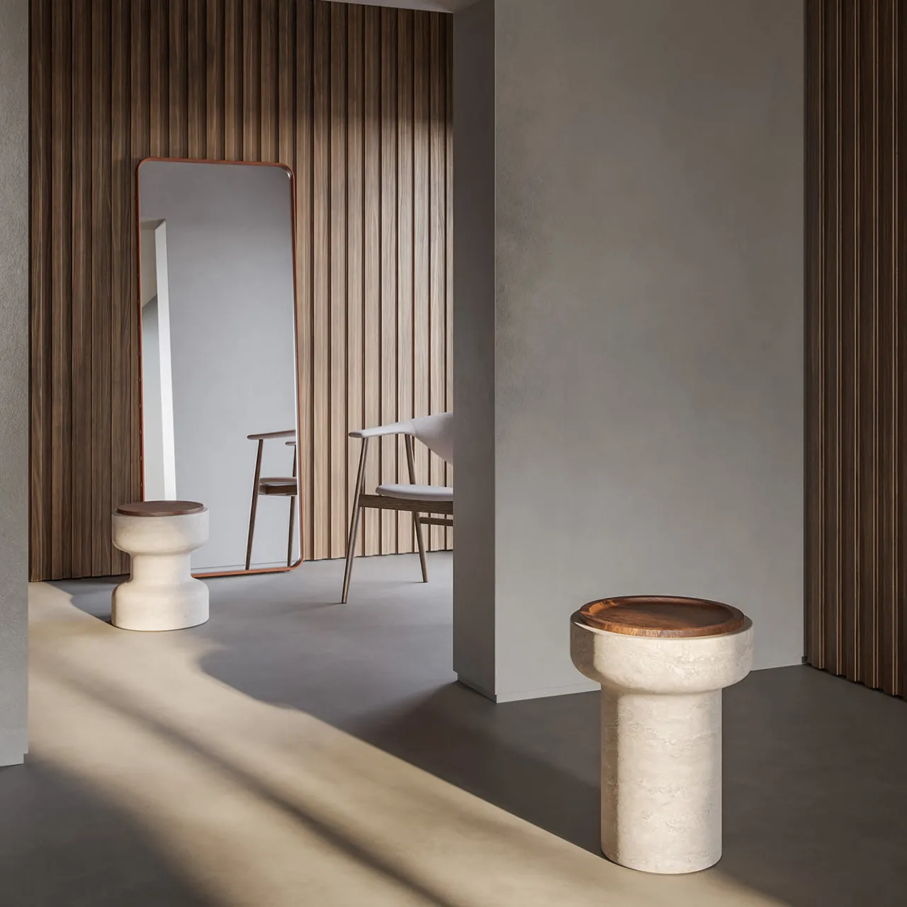 Ivan Colominas rende omaggio alla generosità e alla storia di questa pietra pregiata, nella sua nuova collezione che evoca la gemma di Tivoli. Un abbraccio armonioso tra linee morbide e materiali meravigliosi: Travertino Navona con noce o con una nuova deliziosa tonalità di marmo, l’Emperador Dark. Una festa per gli occhi per celebrare l’essenza della bellezza.