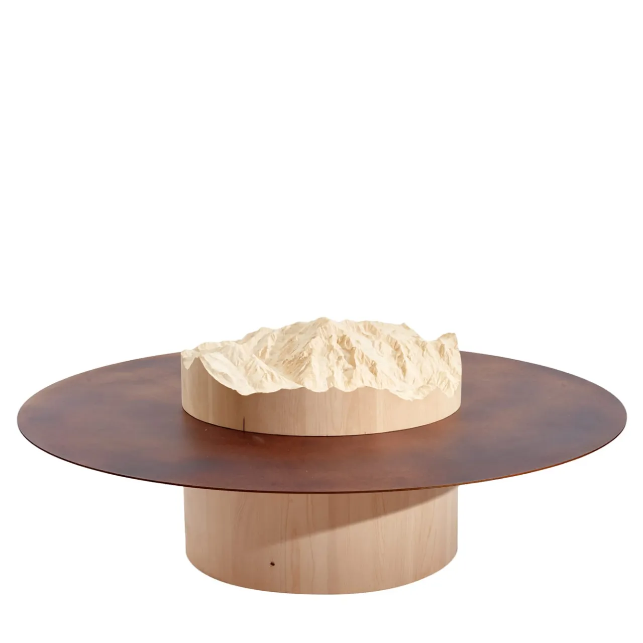 Da una cortina di nuvole spuntano i profili delle montagne dalle cime metalliche. Con picchi e cime di diverse altezze, il tavolino disegna paesaggi domestici che raccontano la storia di ogni montagna. Tip è un tavolino unico, composto da un disco di metallo e da una montagna intagliata su legno massiccio, fedele alla topografia reale. Il soggetto della montagna, la scala topografica e le dimensioni del tavolino possono essere personalizzati su richiesta (chiedere al servizio di Concierge per maggiori dettagli).