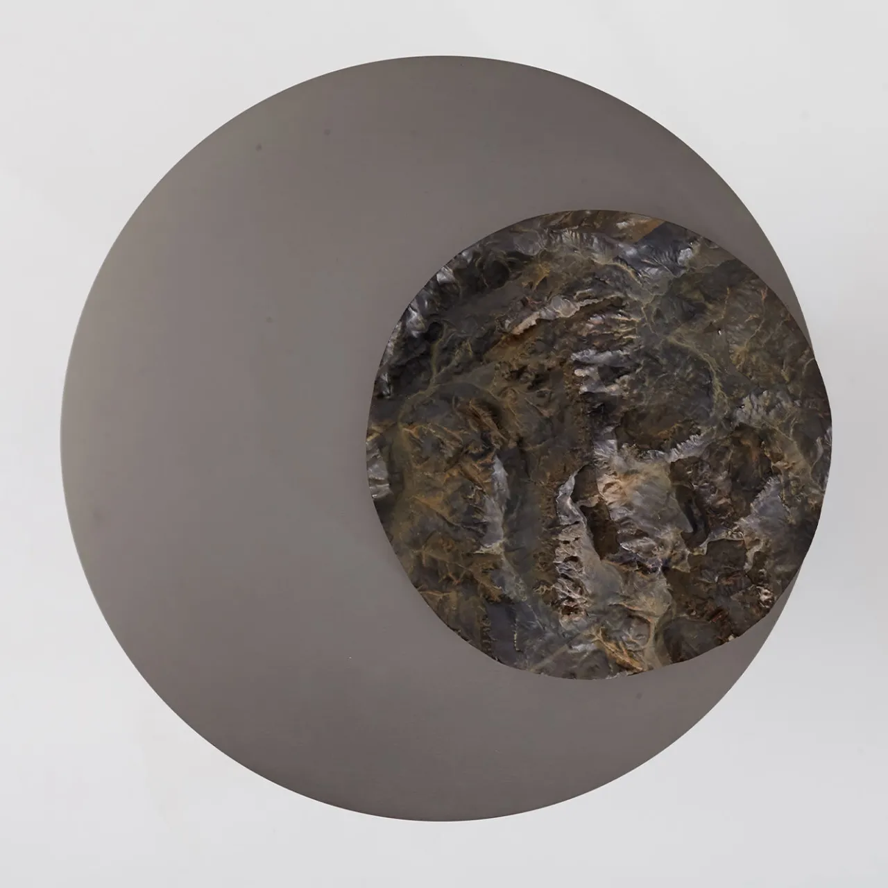 Da una cortina di nuvole spuntano i profili delle montagne dalle cime metalliche. Con picchi e cime di diverse altezze, il tavolino disegna paesaggi domestici che raccontano la storia di ogni montagna. Il piano è un tavolino unico, composto da un disco di metallo e da una montagna intagliata su legno massiccio, fedele alla topografia reale. Il soggetto della montagna, la scala topografica e le dimensioni del tavolino possono essere personalizzati su richiesta (chiedere al servizio di Concierge per maggiori dettagli).