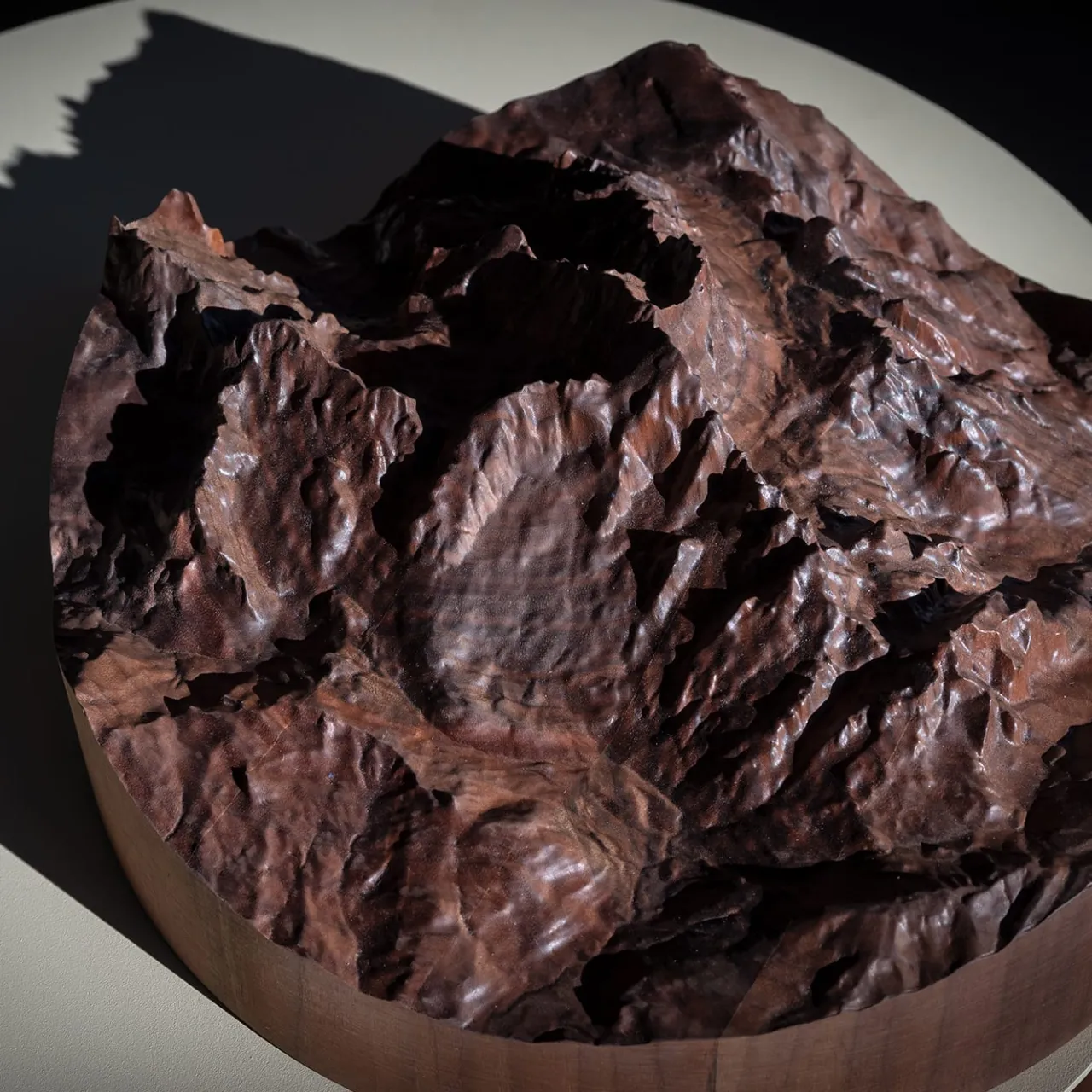 Da una cortina di nuvole spuntano i profili delle montagne dalle cime metalliche. Con picchi e cime di diverse altezze, il tavolino disegna paesaggi domestici che raccontano la storia di ogni montagna. Top è un tavolino unico, composto da un disco di metallo e da una montagna intagliata su legno massiccio, fedele alla topografia reale. Il soggetto della montagna, la scala topografica e le dimensioni del tavolino possono essere personalizzati su richiesta (chiedere al servizio di Concierge per maggiori dettagli).
