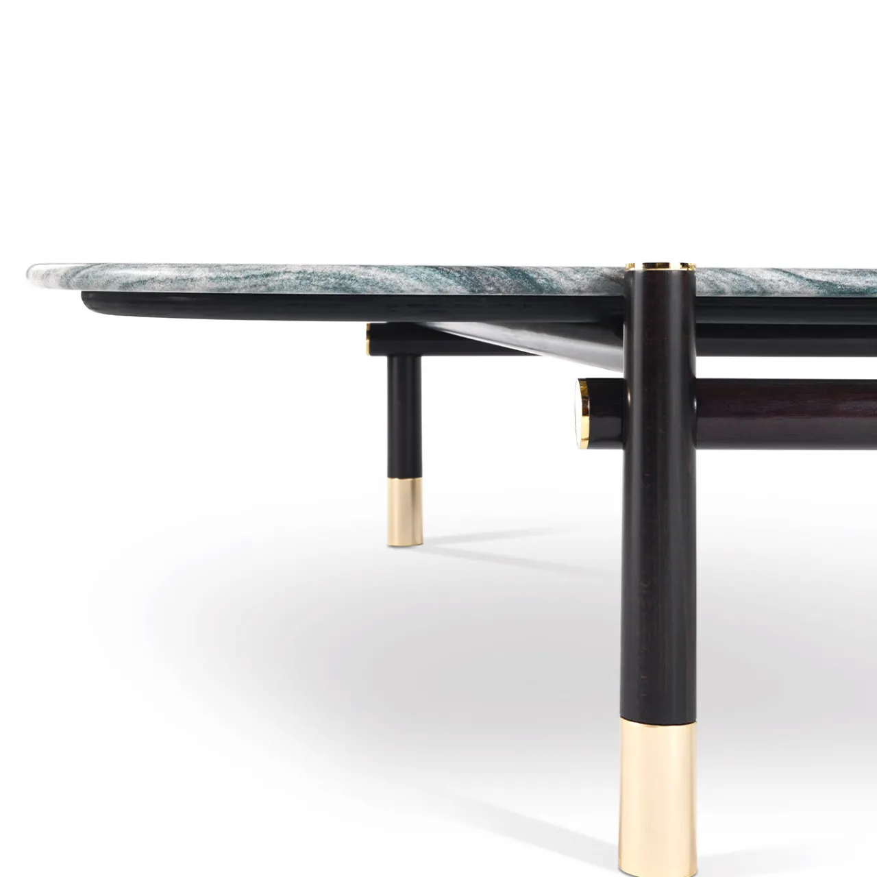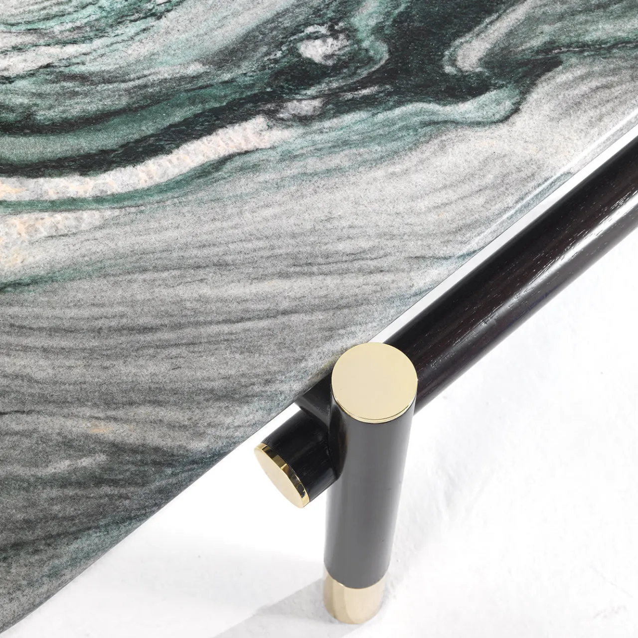 Un tavolo centrale dal fascino prezioso, caratterizzato da un particolare piano in marmo pregiato impreziosito da dettagli raffinati come i puntali in ottone lucido del basamento. Il tavolo è la perfetta espressione della straordinaria artigianalità che caratterizza l’intera collezione. Struttura in legno tinto wengè scuro con puntali in ottone lucido. Piano in marmo cat. A verde polare. Chiedere al Concierge le varianti disponibili.