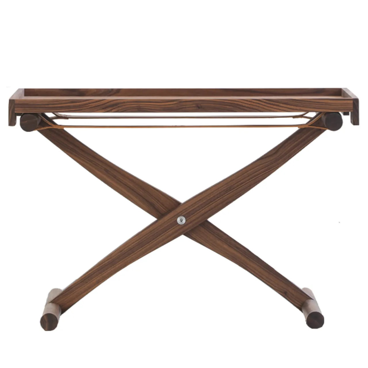 Accessorio chic per aggiungere una superficie funzionale in un salotto moderno, questo tavolino vassoio è realizzato in noce massiccio trattato con olio per conferirgli una finitura protettiva e lucida. La base a X con snodo in acciaio inox presenta un’unica gamba con quattro sostegni cilindrici, arricchiti nella parte superiore da cinghie di cuoio. Il piano è un pratico vassoio con bordi in rilievo che offre una superficie elegante. Questo pezzo può essere utilizzato anche come splendido tavolo da maggiordomo in una stanza degli ospiti o in un bagno, dove aggiungerà un accento rustico-chic.