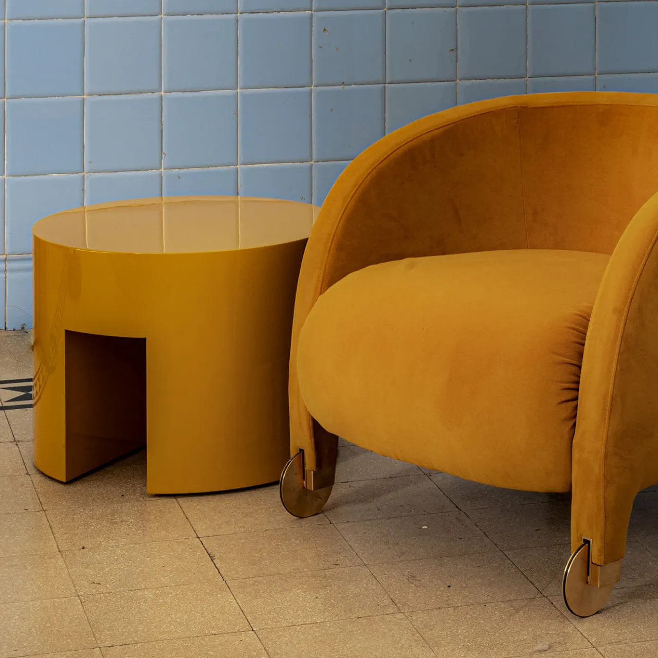 Una serie di tavolini caratterizzati da una particolare laccatura sfumata e da un gesto semplice che, tagliando volumi cilindrici, crea l’oggetto per sottrazione. Una piccola famiglia progettata giocando su circonferenze, altezze e colori diversi. Struttura monolitica composta da mdf alleggerito. Finitura laccata in poliestere giallo miele ad alta lucentezza. Sono disponibili altre finiture laccate; per ulteriori informazioni, contattare il Concierge.