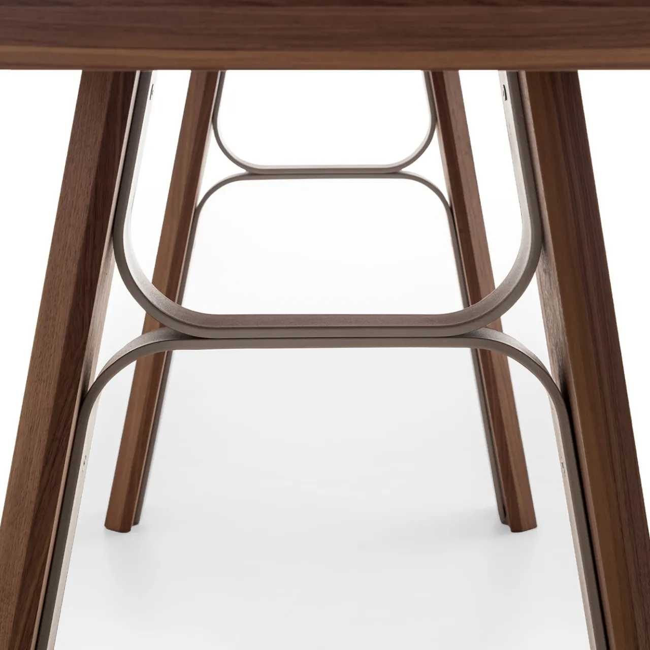 Il pregiato noce Canaletto, con le sue tonalità calde e le sue eleganti venature, è stato scelto come impiallacciatura generale per questo sofisticato tavolo con anima in MDF. Rinforzate da travi metalliche curve verniciate a polvere epossidica, le audaci gambe inclinate guidano lo sguardo verso l’armonioso piano, il cui profilo smussato a 60° è stato meticolosamente rifinito a mano. Ispirato ai ponti dalle linee fluide, il design è disponibile in diverse versioni.