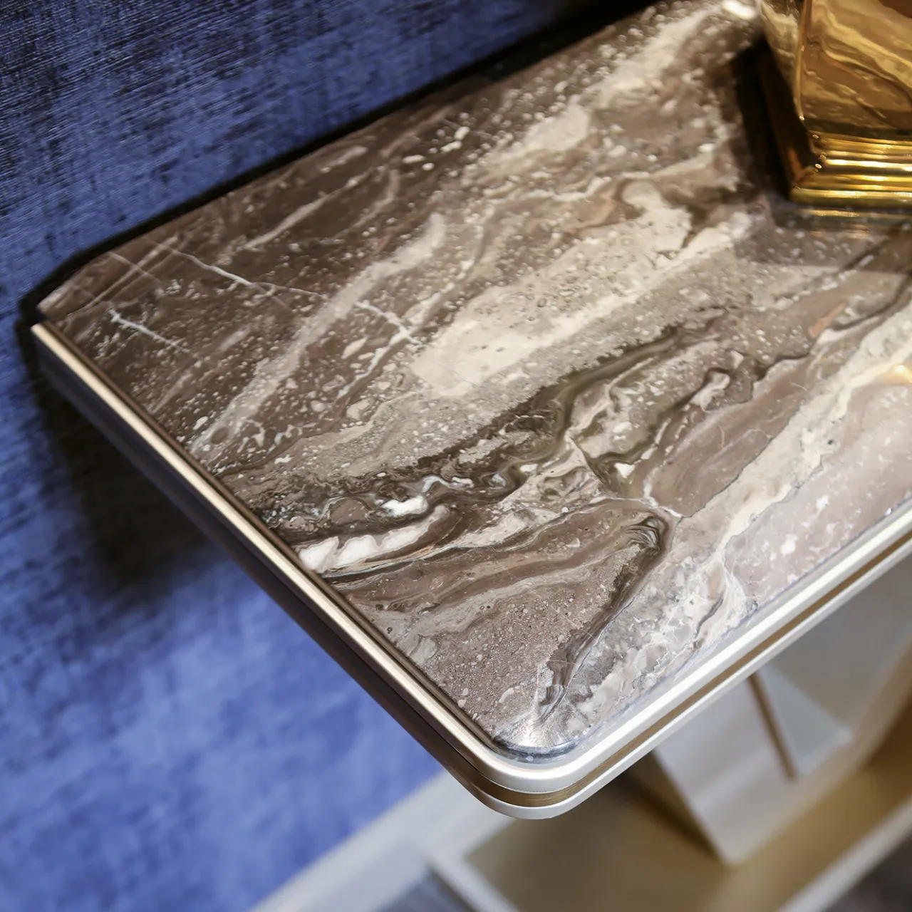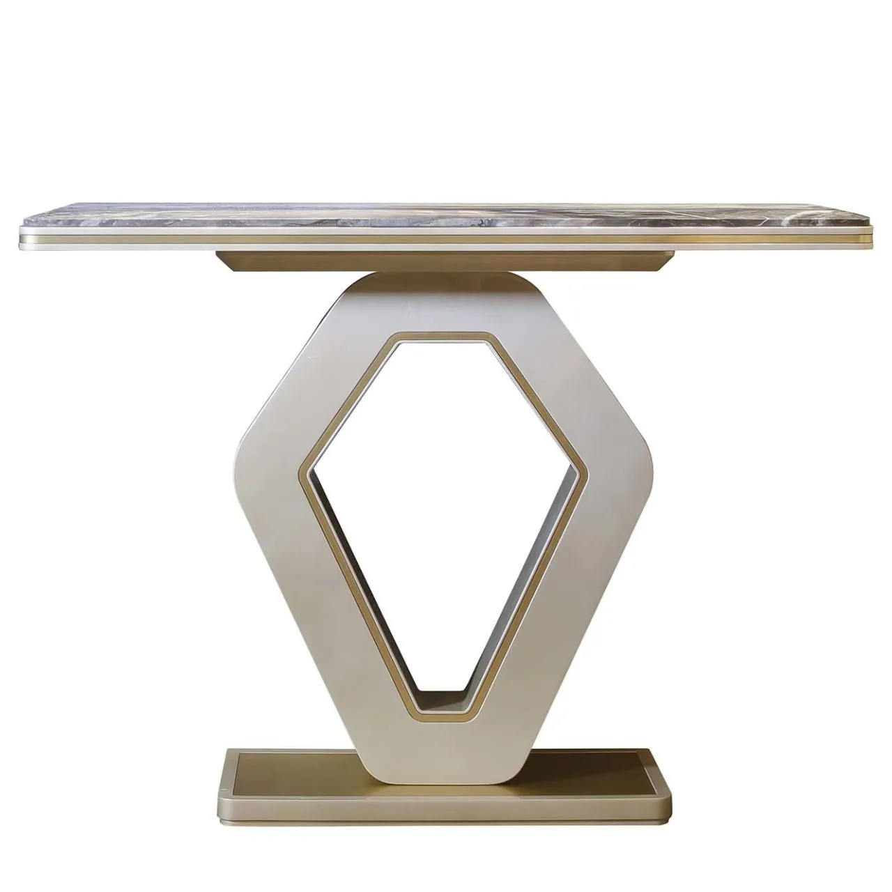 Il tavolo consolle Hanami Soft Style eleva qualsiasi interno con la sua allure glamour e il suo stile sofisticato. Il design è caratterizzato da un’accattivante base geometrica, realizzata in legno massiccio con finitura laccata lucida Pearl Champagne High Gloss. Rifinito con accenti in metallo oro satinato e sormontato da un piano in marmo Orobico grigio smussato.