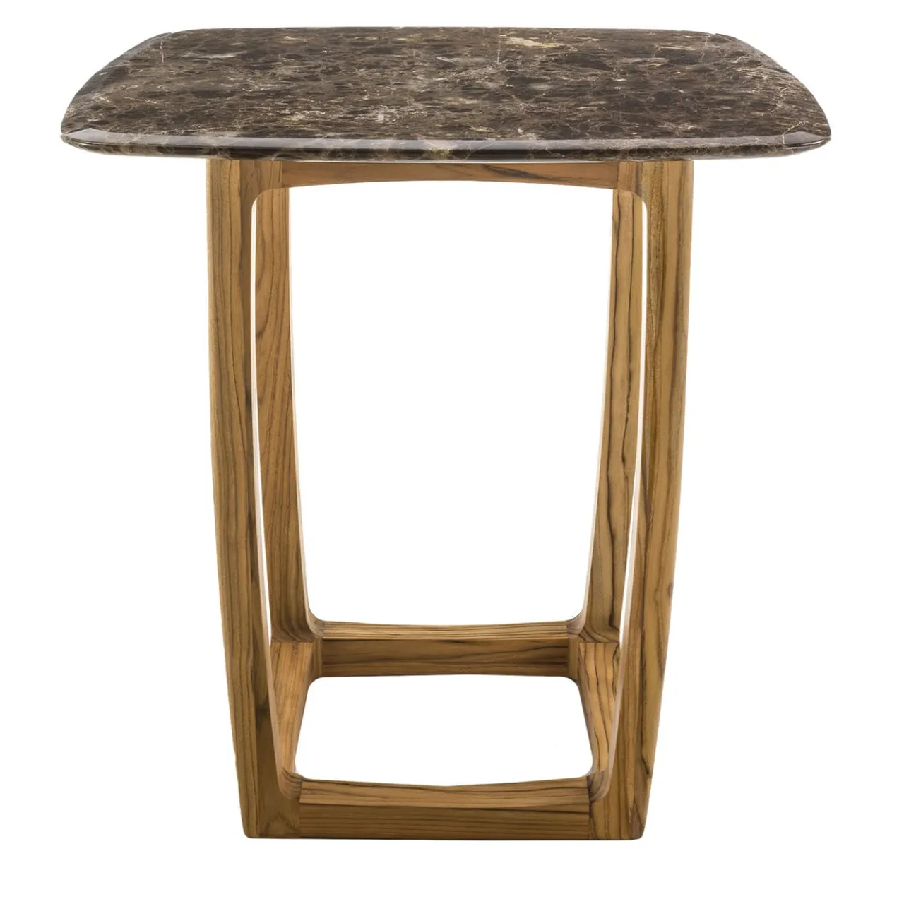 Un design in cui ogni spigolo è tracciato per accoppiare stabilità impeccabile e fascino scultoreo, questo tavolo in teak massiccio è una soluzione squisita per allestire un angolo bar in spazi privati raffinati. Il pregiato piano in marmo Emperador Dark presenta bordi smussati, un dettaglio che si armonizza con il profilo leggermente convesso dei bordi verticali della struttura.