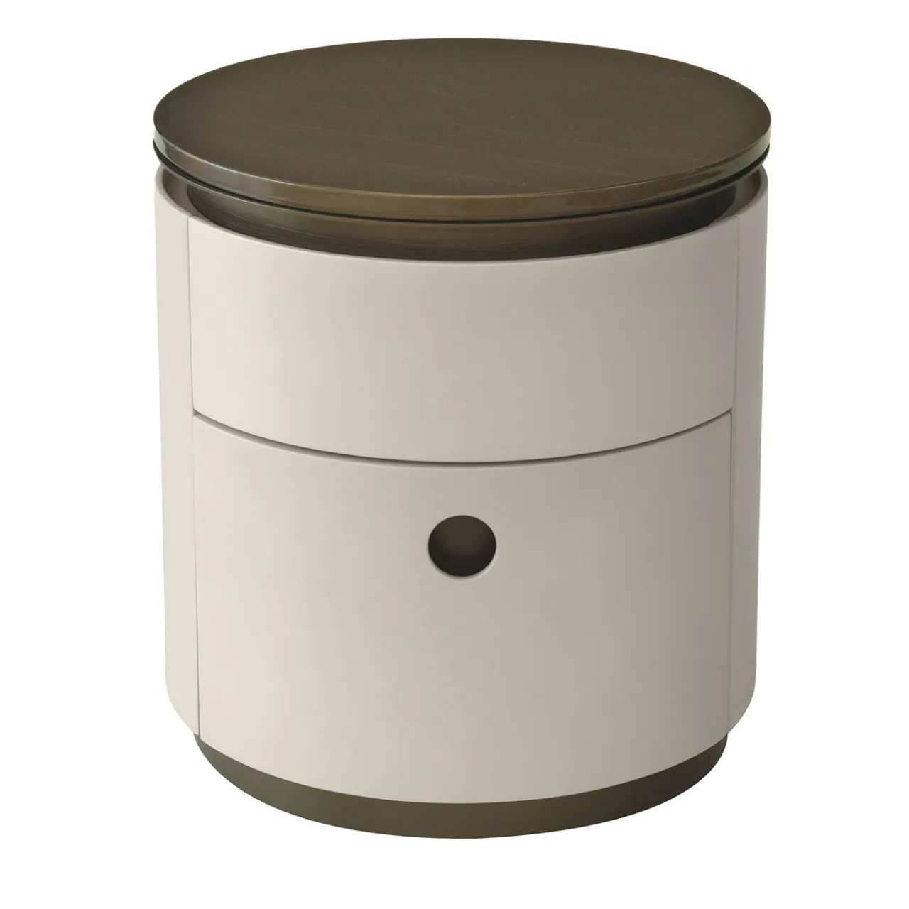 Un design elegante e distintivo della serie Loop, questo comodino è caratterizzato da una semplice forma cilindrica, abilmente lavorata e rifinita in un complemento ergonomico dal fascino senza tempo. Realizzato in compensato curvato e MDF, la struttura è rifinita con una laccatura in poliestere champagne perlato, che contrasta elegantemente con il piano in metallo con finitura bronzo spazzolato e i dettagli in bronzo satinato. Completato da due cassetti con chiusura ammortizzata, è disponibile con piano in marmo e in altri colori.