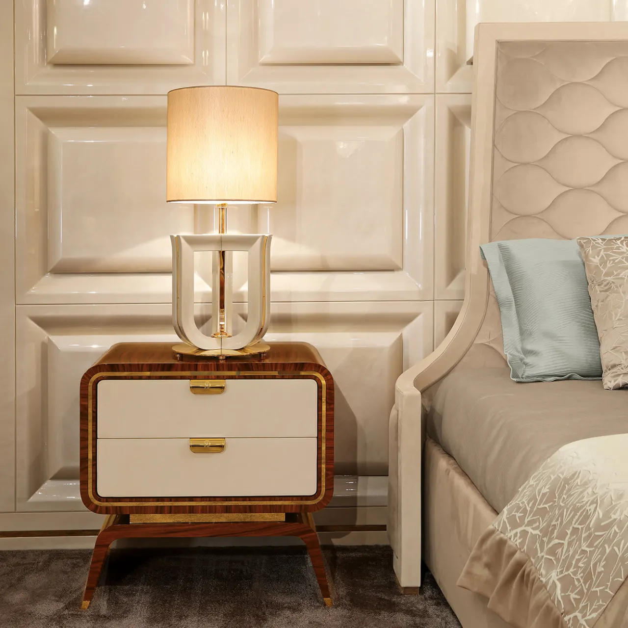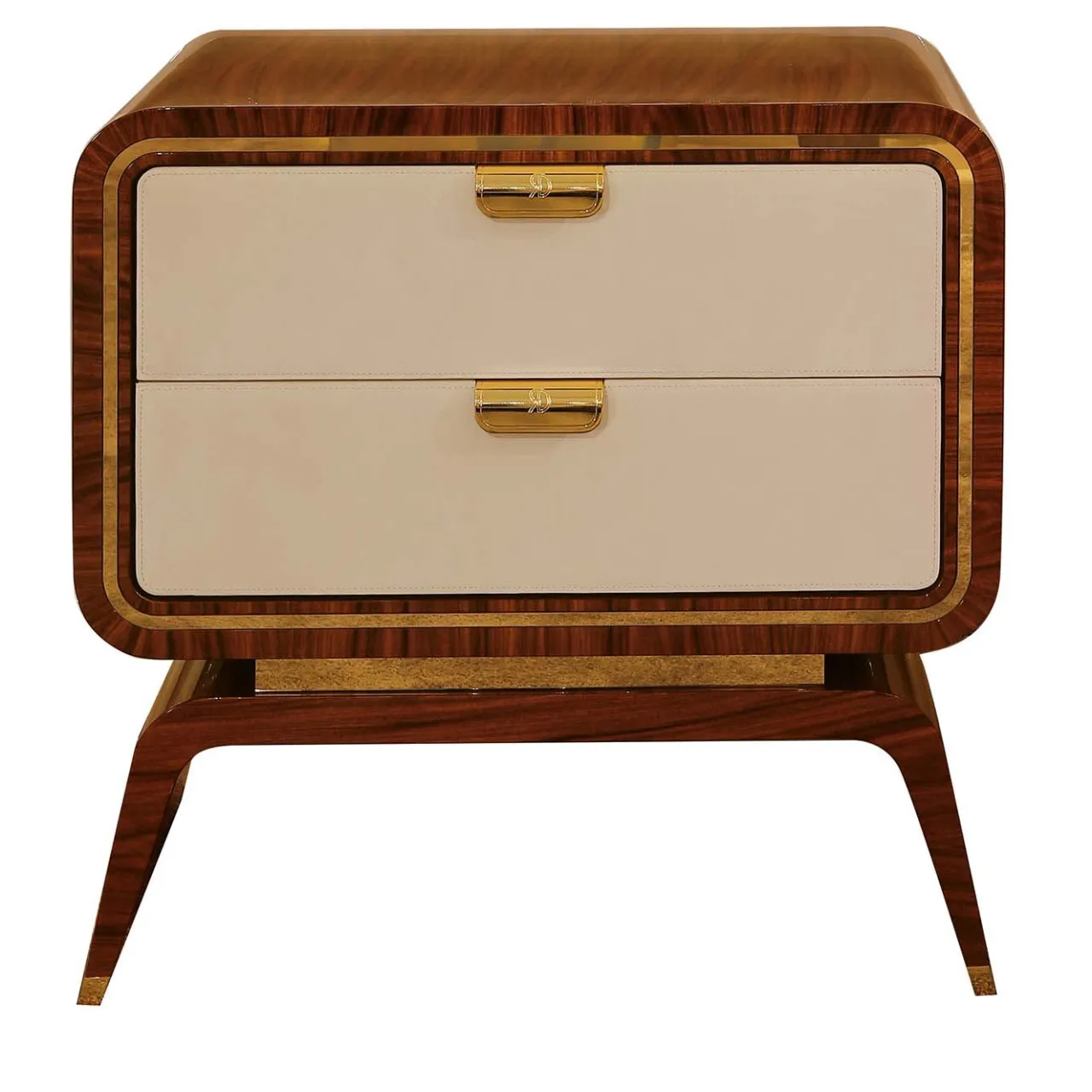 Questo comodino di ispirazione scandinava è realizzato in legno massiccio. La sua finitura impiallacciata Palissandro Santos emana una calda eleganza, arricchita da accenti in metallo dorato per un tocco di lusso. Il comodino Unique è dotato di due cassetti con chiusura ammortizzata e frontali in nabuk cucito, che lo rendono un complemento d’arredo elegante e funzionale.