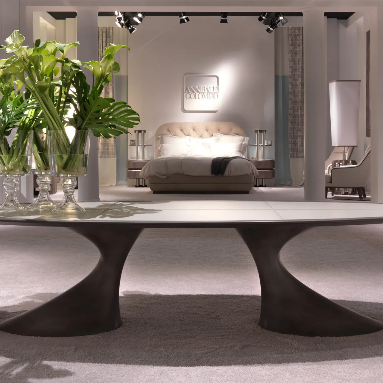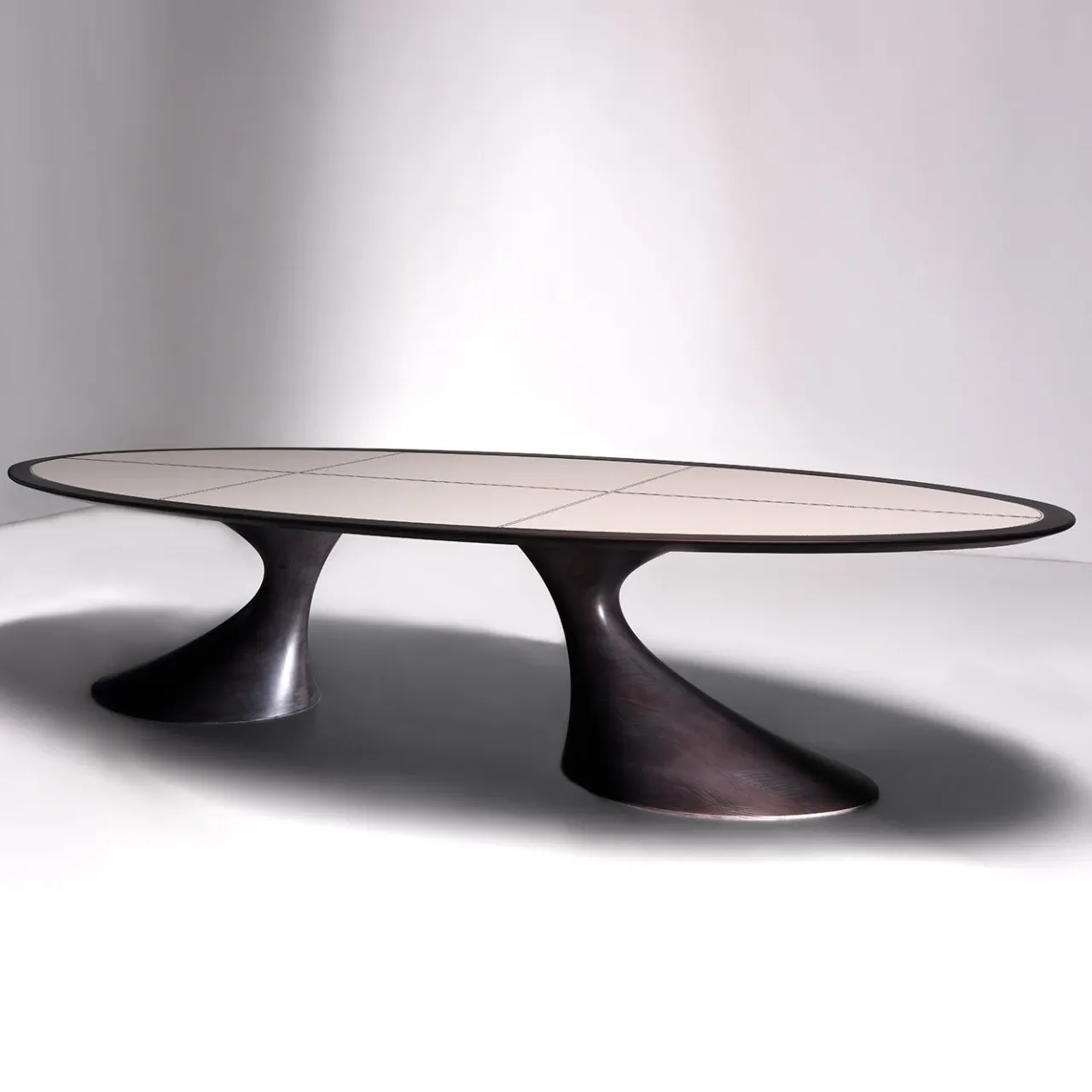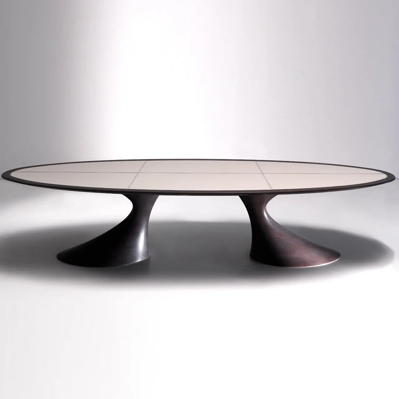 Questo tavolo da pranzo scultoreo è uno splendido elemento d’arredo attorno al quale riunirsi. Il suo profilo intrigante è caratterizzato da curve morbide e drammatiche in un design che sarà al centro della scena in qualsiasi arredamento contemporaneo. Il design sinuoso e accattivante delle due gambe in legno massiccio è ottenuto grazie a un abile processo di tornitura. Inserti in pelle chiara rivestono il piano ovale aggiungendo intrecci cromatici e di texture di alto valore estetico.