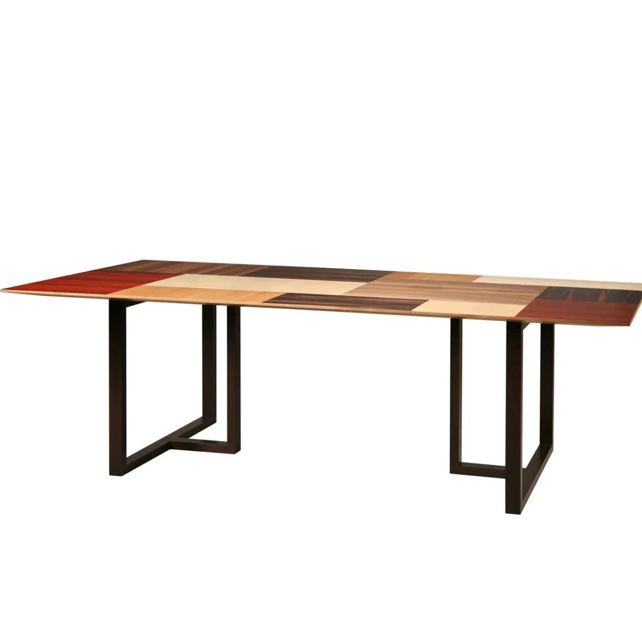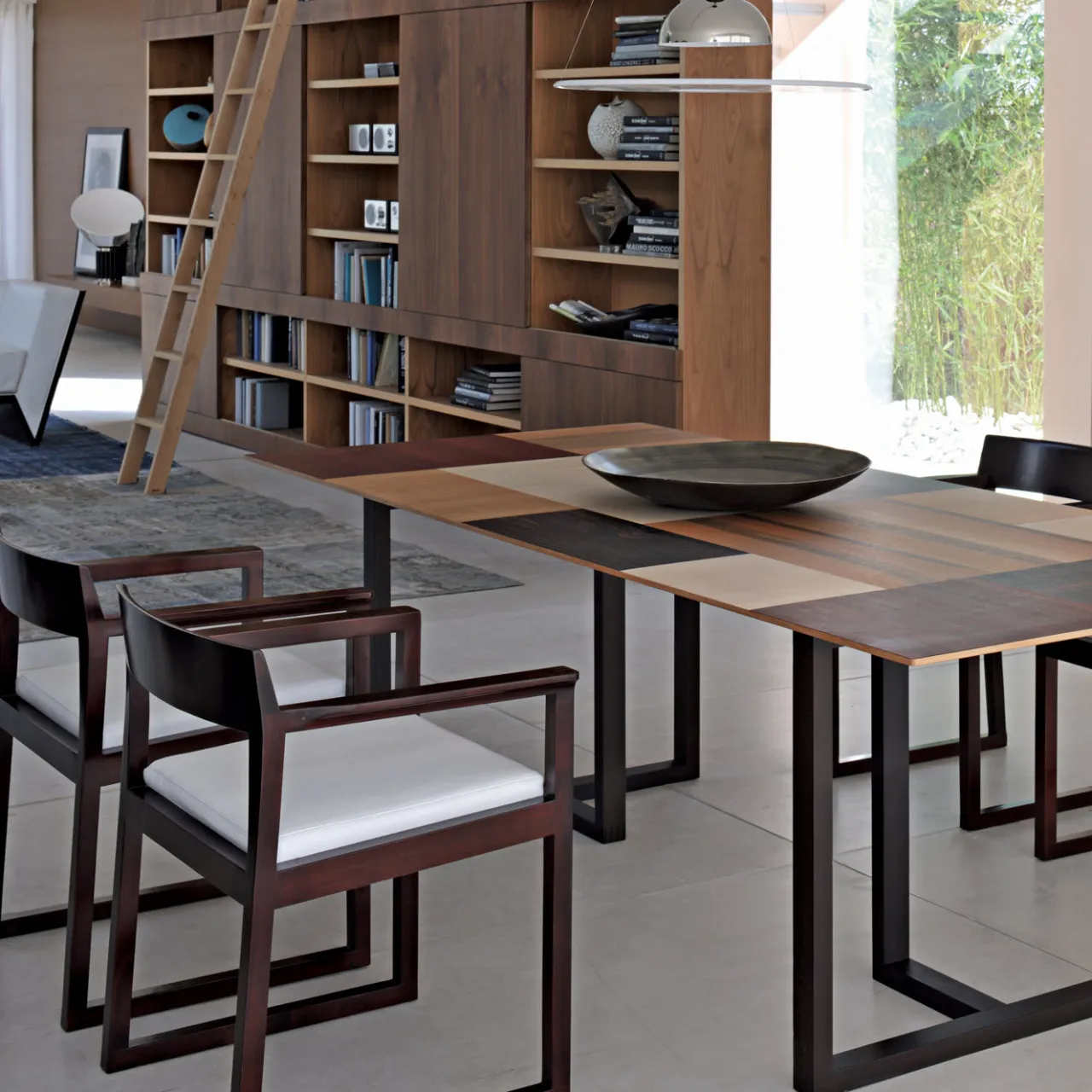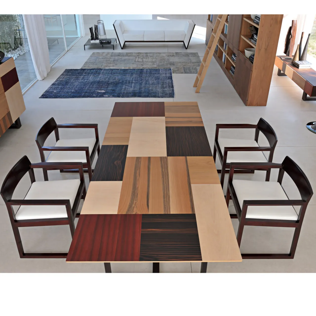 Parte della collezione Patchwork disegnata da Maurizio Duranti per Morelato, questo tavolo da pranzo presenta un piano realizzato con patch di legni diversi: wengé, noce, acero, padauk, ebano e ciliegio. Il risultato è un pezzo giocoso che si inserisce in un arredamento contemporaneo, evocando allo stesso tempo l’arte tradizionale della falegnameria. Utilizzato da solo o abbinato ad altri pezzi della stessa serie, questo tavolo è un’opera d’arte funzionale.