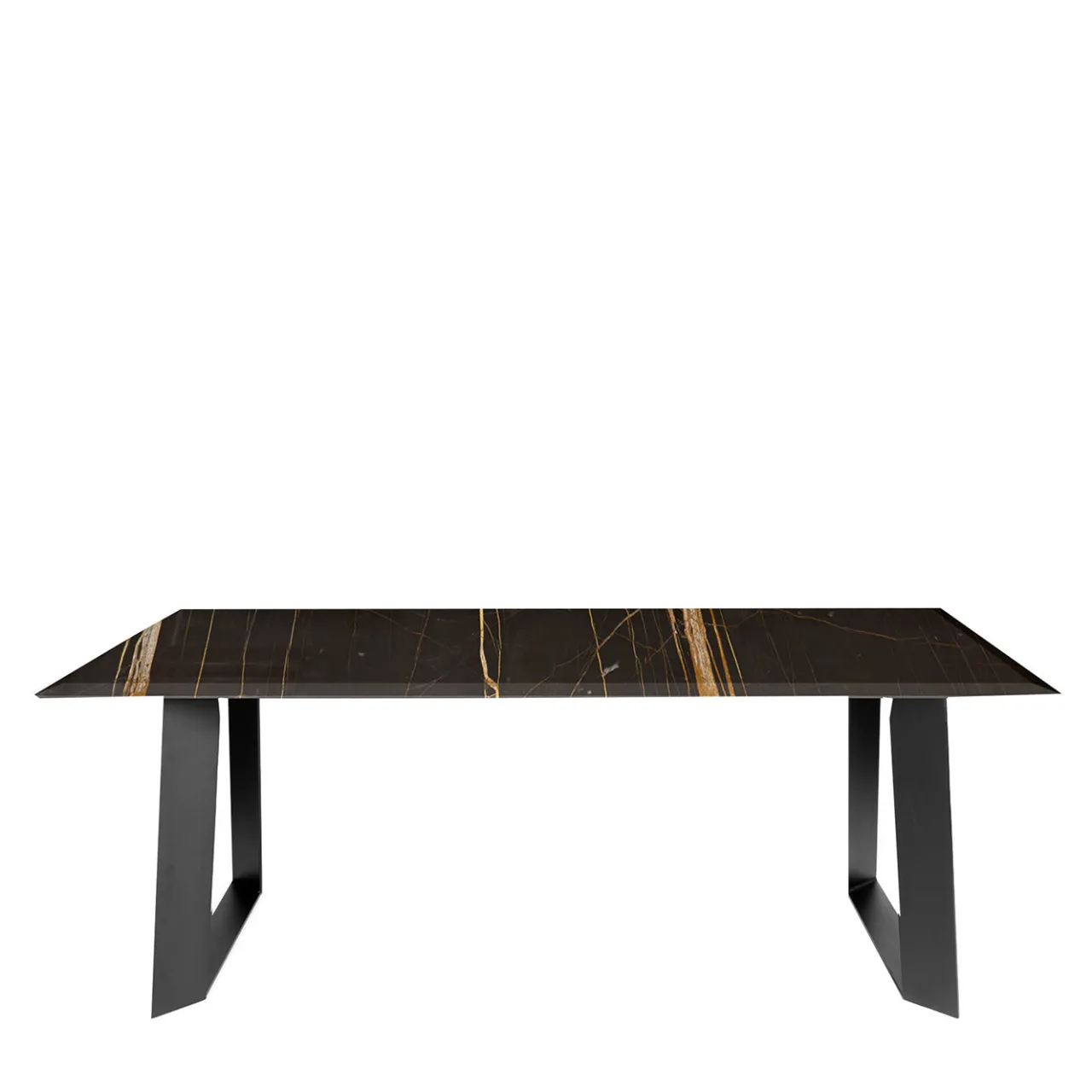 Il design eccezionalmente elegante di questo tavolo da pranzo rivela un’impeccabile maestria artigianale e il fascino naturale del marmo. Realizzato minuziosamente a mano, presenta una base in ferro laccato nero con un profilo geometrico di grande effetto, che sostiene un piano rettangolare in Sahara Noir. Questo pezzo è disponibile nelle finiture metalliche oro o grigio e, su richiesta, in altri tipi di marmo.