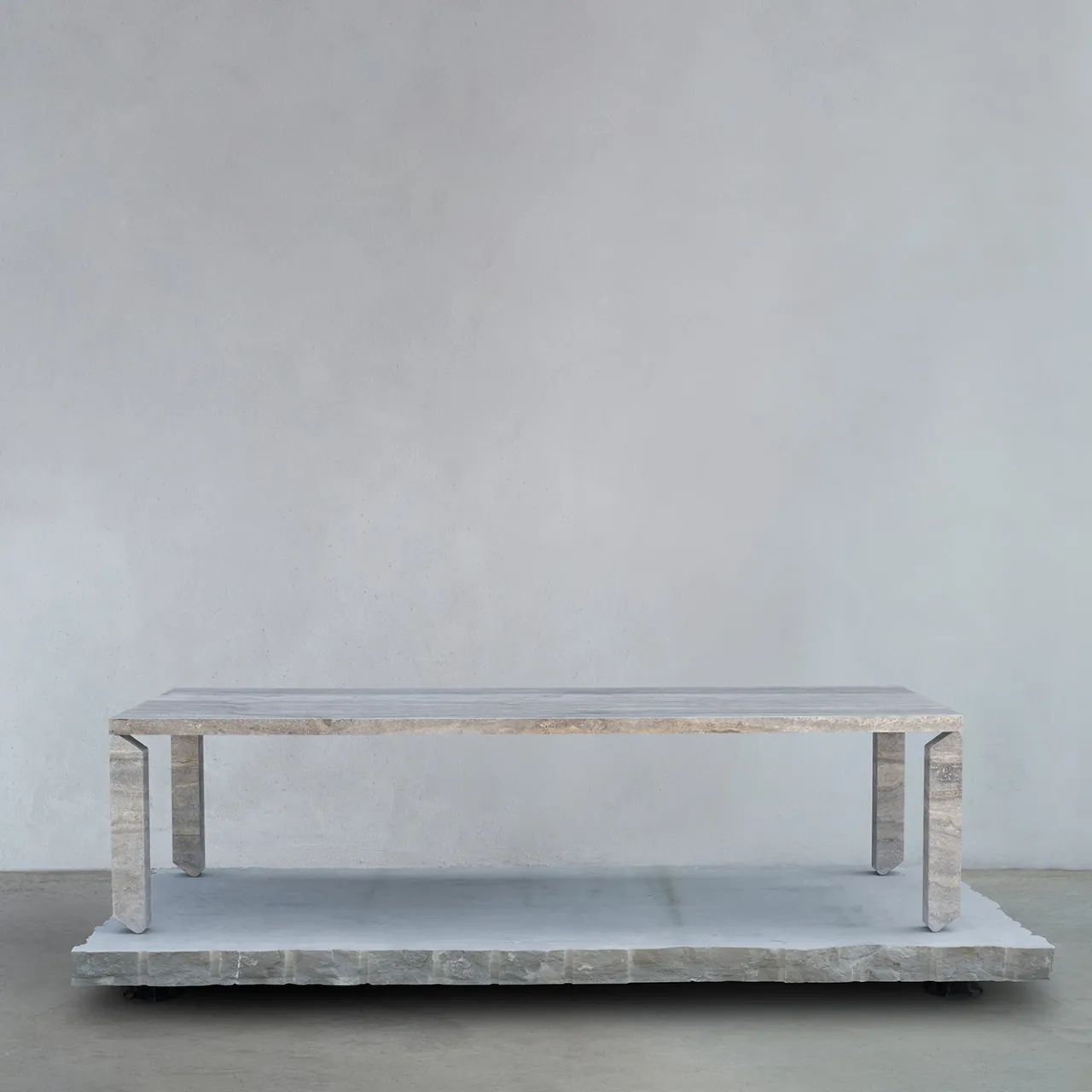 Quattro gambe in pietra sono limate fino al loro limite, formando ciascuna due bordi raffinati e snelli. Adagiata delicatamente su queste estremità c’è una superficie piana mantenuta in perfetto equilibrio, evocando un senso di leggerezza e sospensione. La composizione complessiva suggerisce quattro figure in punta di piedi, catturate in un equilibrio perpetuo tra la chiarezza lineare del piano e la solidità del terreno. Interamente realizzata in marmo grigio, questa opera esprime grazia scultorea e precisione materiale.