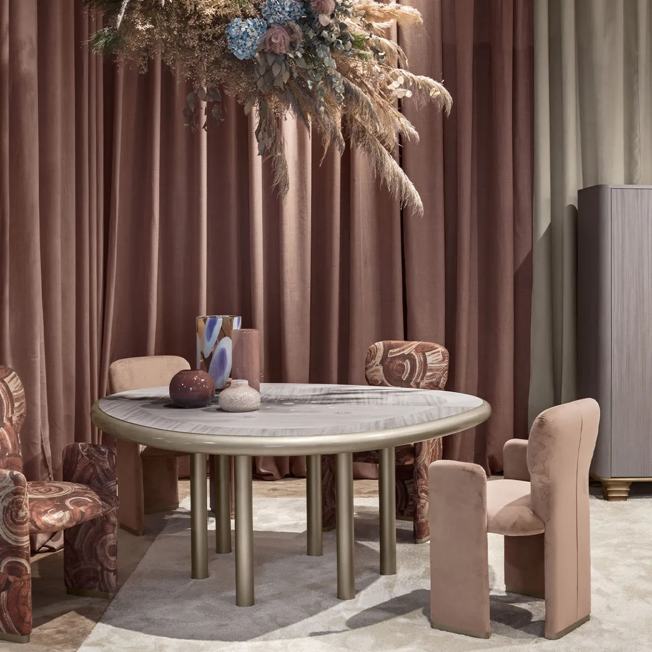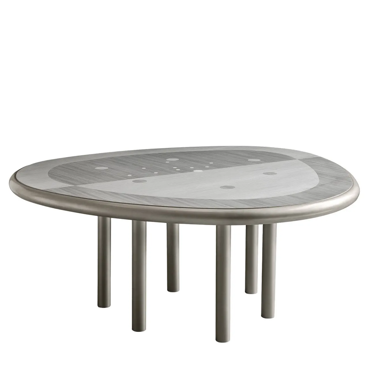 Un vivace intarsio astratto che combina il grigio caldo e il bianco del legno contraddistingue questo accattivante tavolo da pranzo, ideale complemento di raffinati arredamenti moderni. L’aspetto accattivante del piano è sapientemente controbilanciato dalla rigorosa forma cilindrica delle gambe che, con il loro tono grigio caldo, conferiscono coerenza alla palette cromatica generale.