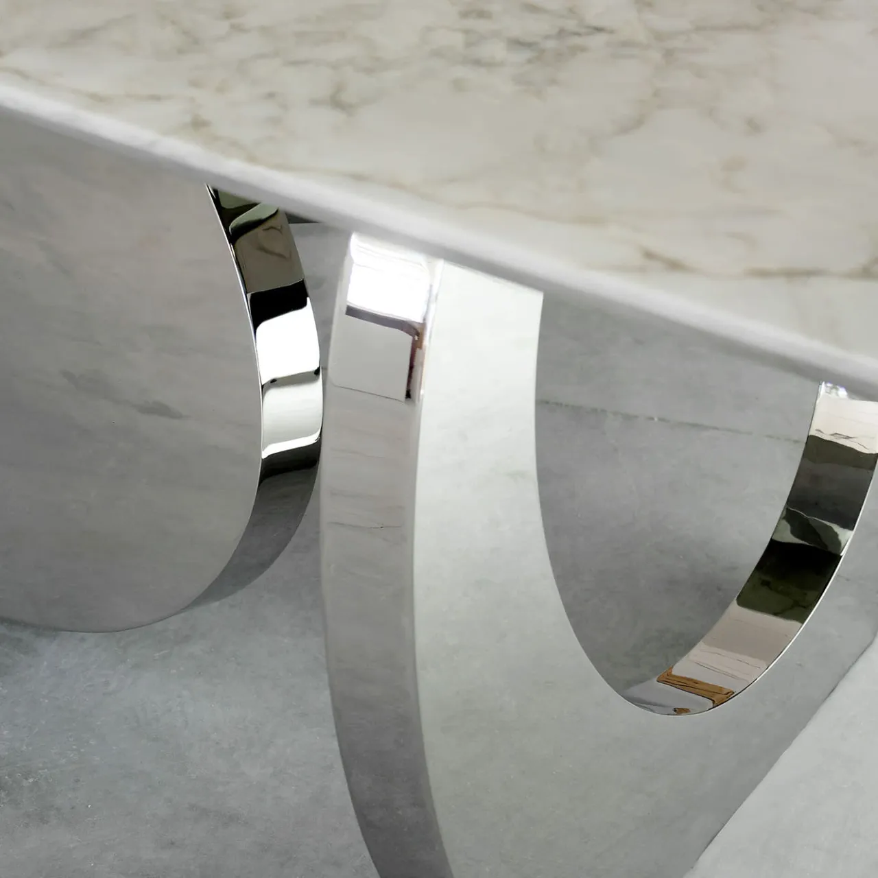 Il tavolo da pranzo Bangles è strutturato in acciaio inox lucidato a specchio e piano in quarzite. La finitura a specchio dell’acciaio crea diverse percezioni e permette interessanti riflessi di luce. Edizione limitata di 15 pezzi. Ogni singolo braccialetto è saldato e lucidato a mano. Il tavolo da pranzo scultoreo Bangles è stato scelto da Ridley Scott per il suo film House of Gucci. Ogni tavolo è firmato a mano, numerato dall’artista e realizzato al 100% a mano in Italia. Le dimensioni e il piano possono essere personalizzati.