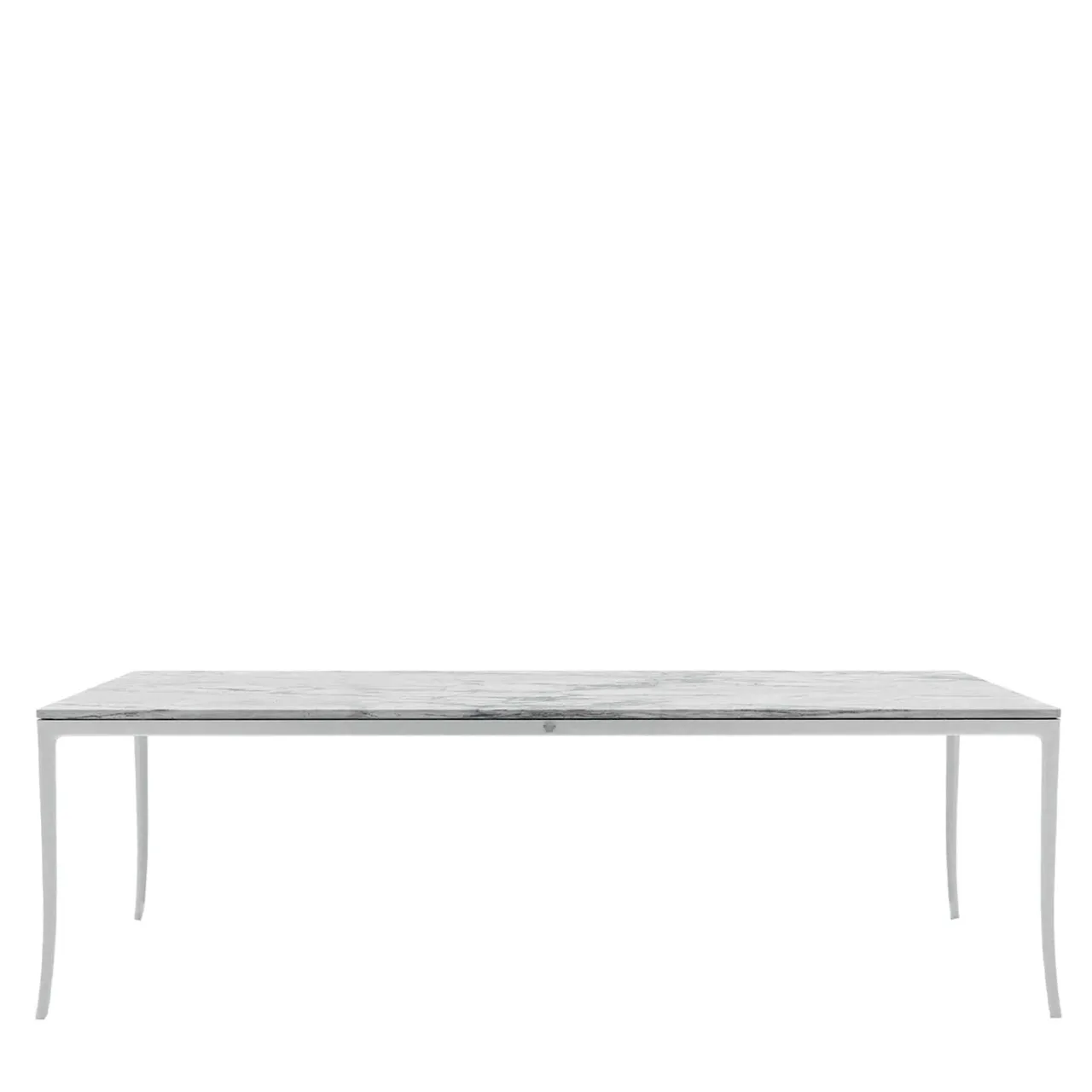 Ribelle e sofisticato, il tavolo da pranzo outdoor Stiletto in marmo Super White presenta una struttura in alluminio con una finitura bianca opaca e un logo Medusa in metallo 3D coordinato. Il piano del tavolo è realizzato in marmo Super White con una finitura lucida, completato da un sottopiano in acciaio inox nero opaco. Le sue gambe dal design snello completano l’elegante silhouette, rendendolo perfetto per ambienti outdoor raffinati. Disponibile anche con un piano in marmo Galaxy Stone. Si prega di contattare il Concierge per ulteriori informazioni.