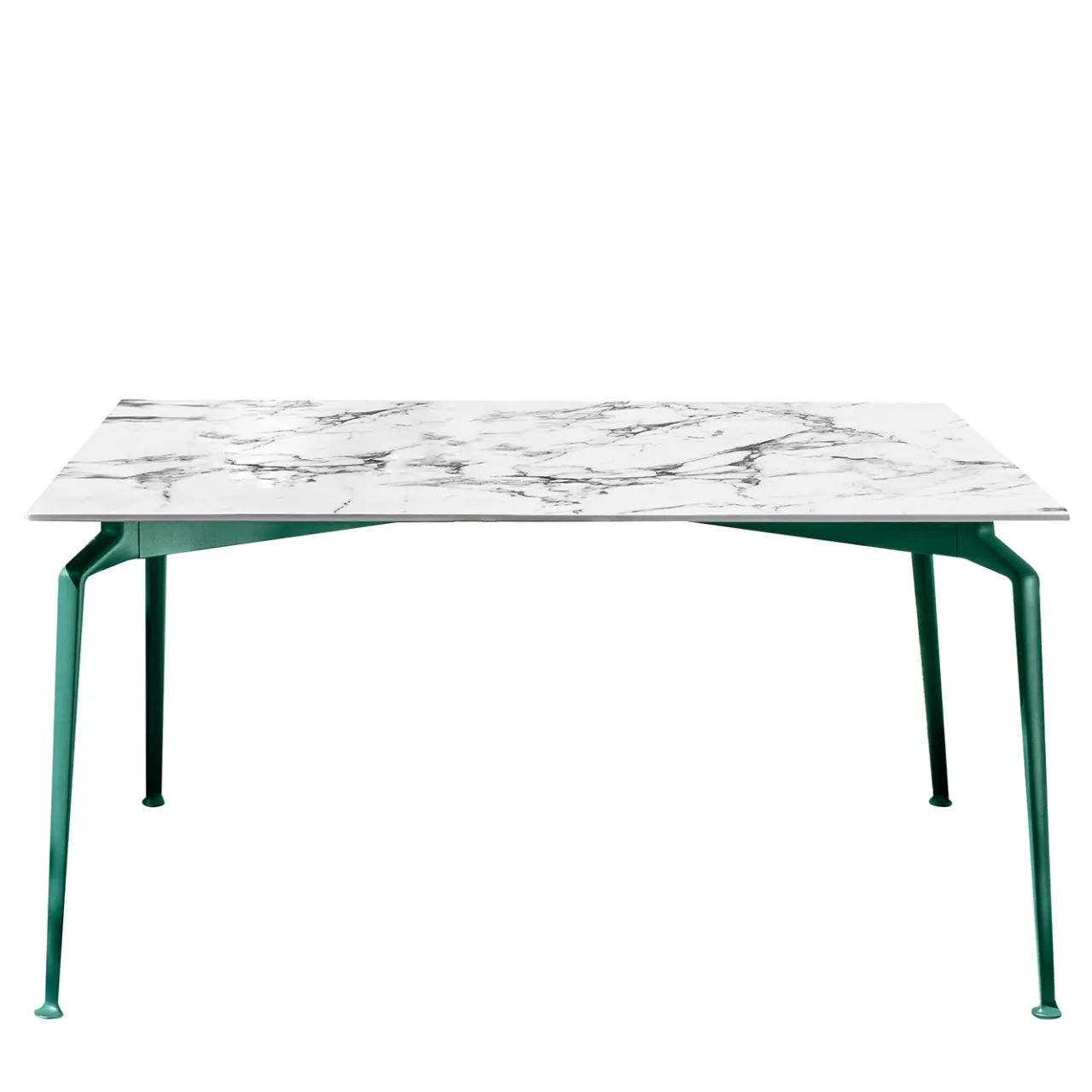 Squisito esercizio di contrasti, questo stupendo tavolo da pranzo è caratterizzato da gambe in alluminio laccato verde accostate a un piano in marmo bianco Calacatta. Definito da linee pulite e slanciate, è stato disegnato da Ludovica e Roberto Palomba e sarà al centro di un elegante arredamento di stile contemporaneo.