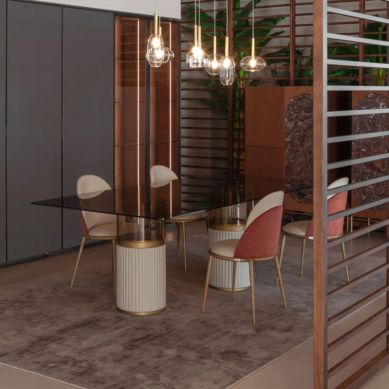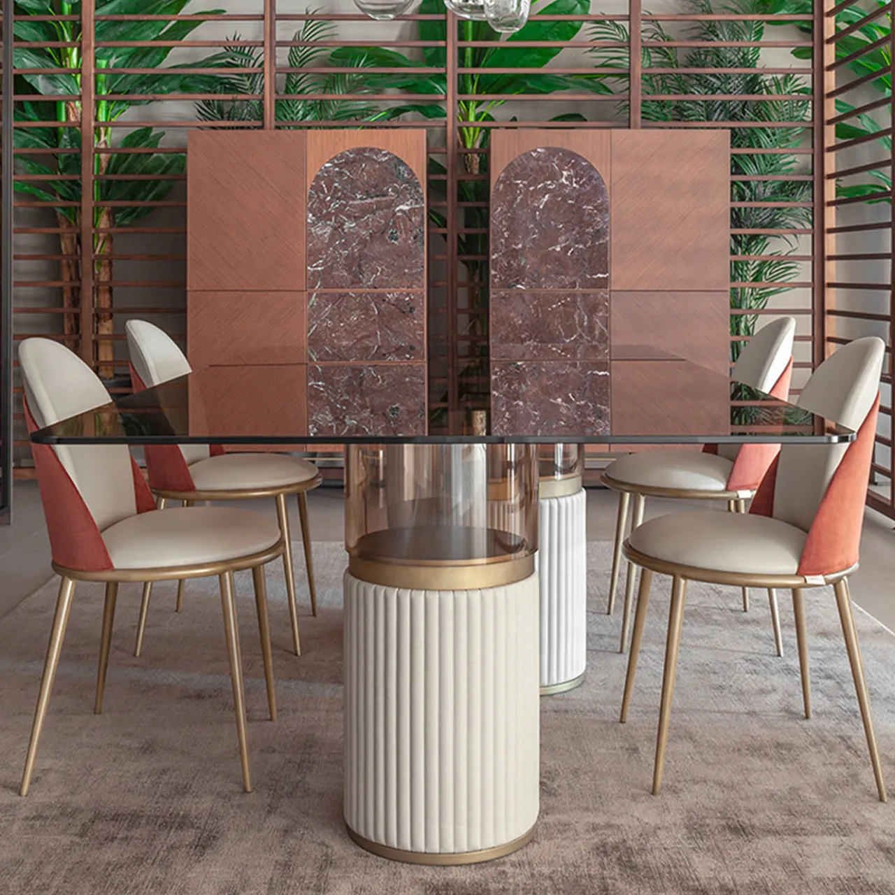 Definito da raffinate linee scultoree e da proporzioni asimmetriche ma equilibrate, questo splendido tavolo da pranzo abbina un piano rettangolare in vetro bronzato a una base straordinariamente composta in Vitroplex e pelle pregiata. La pelle, che presenta una tonalità crema impreziosita da spettacolari cuciture verticali, può essere personalizzata nel colore e nel tipo su richiesta. Per ulteriori opzioni di personalizzazione, rivolgersi al Concierge.