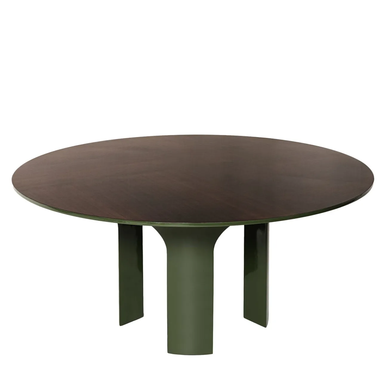 Il tavolo da pranzo Archi Round di Storagemilano è caratterizzato da una base scultorea composta da quattro gambe che convergono a formare una serie di archi ispirati alle volte rinascimentali, creando un fulcro architettonico. Il piano circolare è rifinito con vernice poliestere lucida in eucalipto, intagliato in un raffinato motivo a quattro spicchi che esalta il gioco dinamico di luci e ombre sulla base laccata lucida verde.