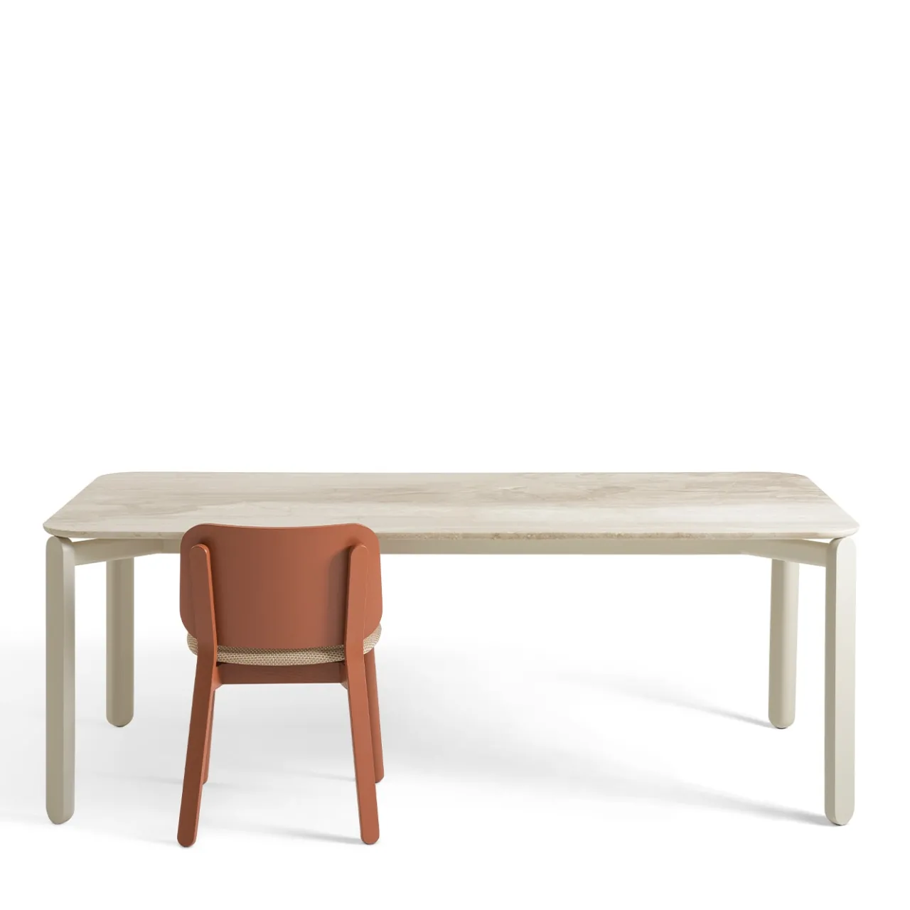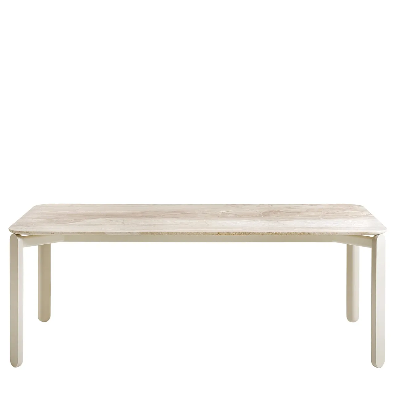 Il tavolo da pranzo Babà 878, disegnato da Emilio Nanni, ha una forma morbidamente arrotondata e curvilinea che fonde il design contemporaneo con le influenze mediterranee. Il piano in marmo Daino Reale beige è sorretto da una struttura in metallo verniciato e da gambe in legno di frassino con finitura liscia, a dimostrazione della raffinata artigianalità e dell’eleganza dei materiali.