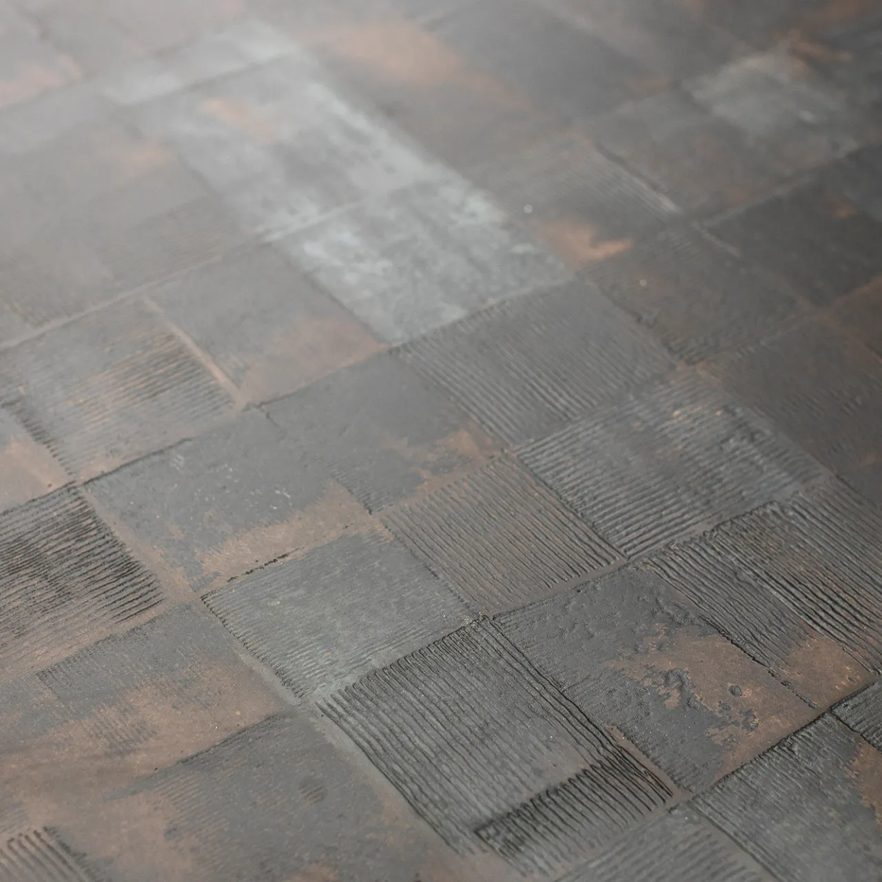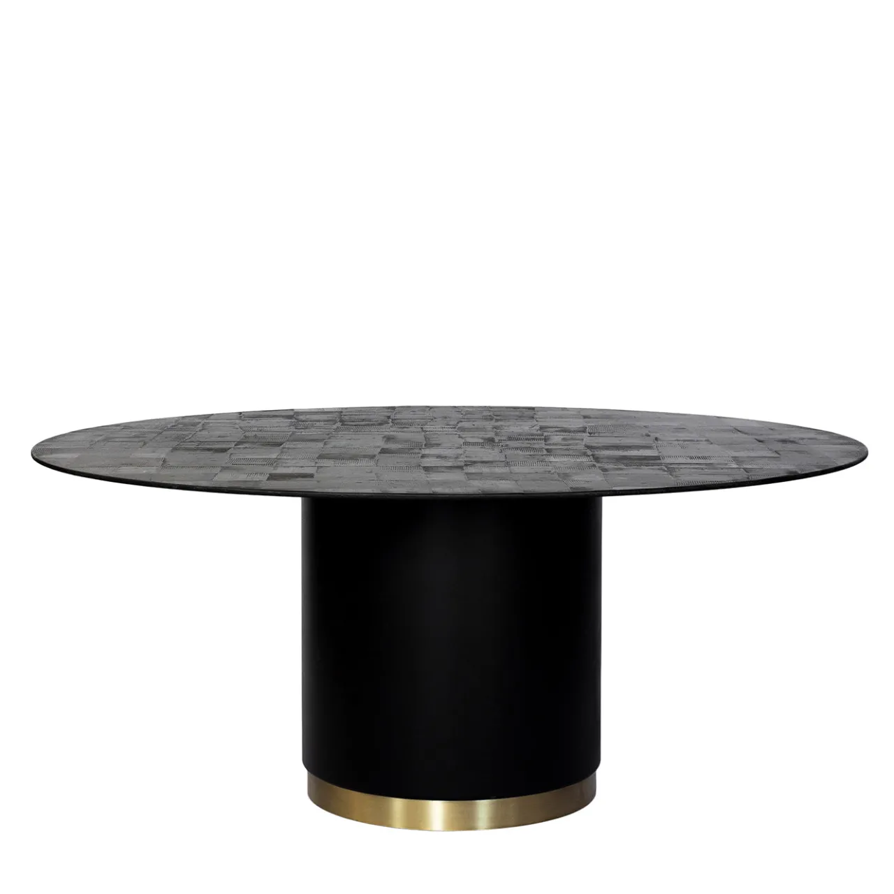 Tavolo di medie dimensioni con una superficie caratterizzata da un motivo a griglia irregolare che contrasta con la sua forma perfettamente circolare. La parte superiore presenta finiture di patine bronzo, rame e ossido di ferro, che esaltano la sua estetica elegante e suggestiva. Sorretto da una solida base cilindrica con dettagli in ottone, il tavolo combina un design raffinato con dimensioni personalizzabili, adattandosi perfettamente agli interni moderni. Per ulteriori informazioni, si prega di contattare il Concierge.