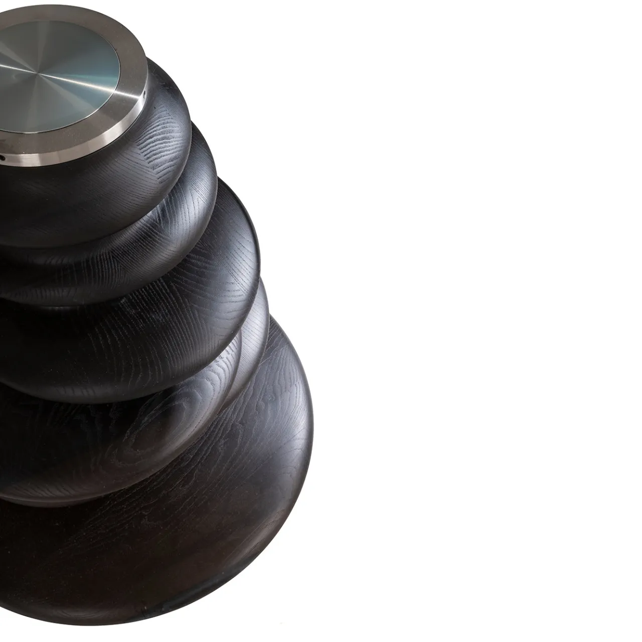Un’imponente tavola da pranzo rotonda caratterizzata da una base scultorea composta da forme circolari irregolari sovrapposte, rifinite in legno di frassino tinto di nero. Il piano in vetro extralight offre una trasparenza raffinata che contrasta con la profondità strutturata della base. Questo tavolo di medie dimensioni unisce design contemporaneo ed espressione artistica, fungendo sia da superficie di pranzo funzionale che da elemento centrale distintivo. Le sue proporzioni bilanciate ospitano incontri intimi, aggiungendo al contempo interesse visivo agli spazi per la cena. Progettato da Marco Cocco.