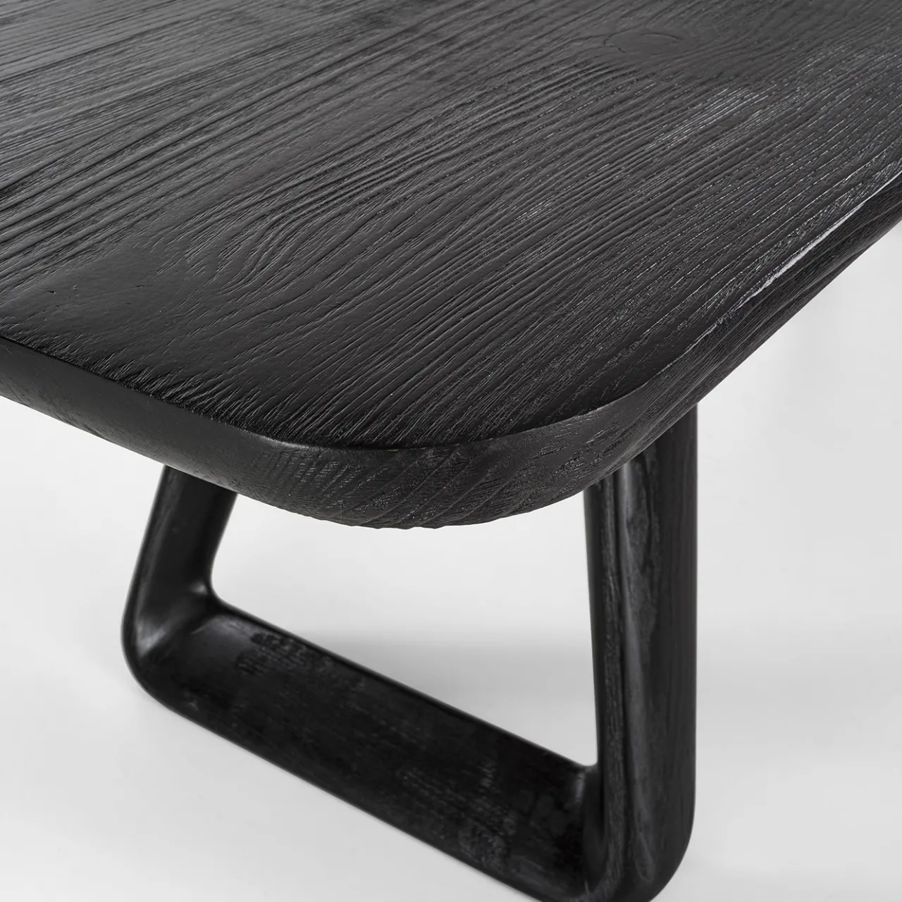 Tavolo da pranzo con piano in legno massello nero composto da doghe incollate e bordi smussati, sorretto da due gambe realizzate interamente in legno massello. La geometria raffinata delle gambe unisce linee rette, curve e angoli arrotondati, creando un equilibrio elegante. Progettato da Claudio Bellini, il tavolo presenta un’estetica moderna e raffinata, perfetta per ambienti pranzo sofisticati.