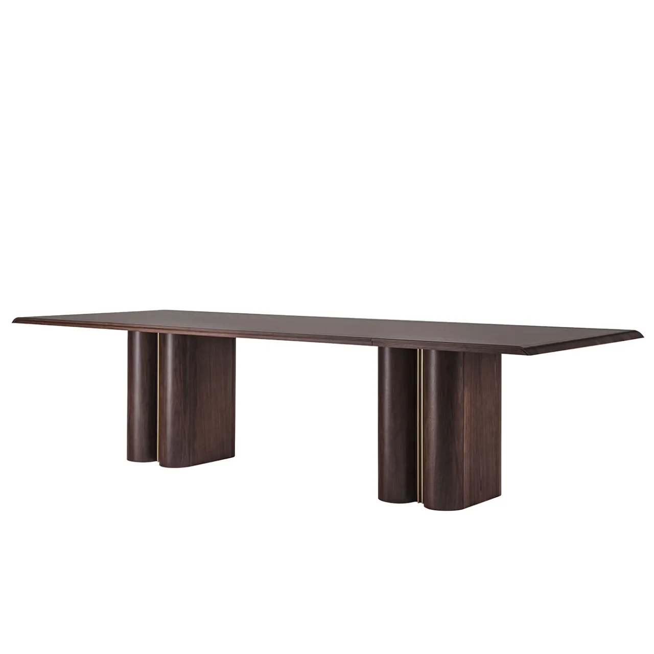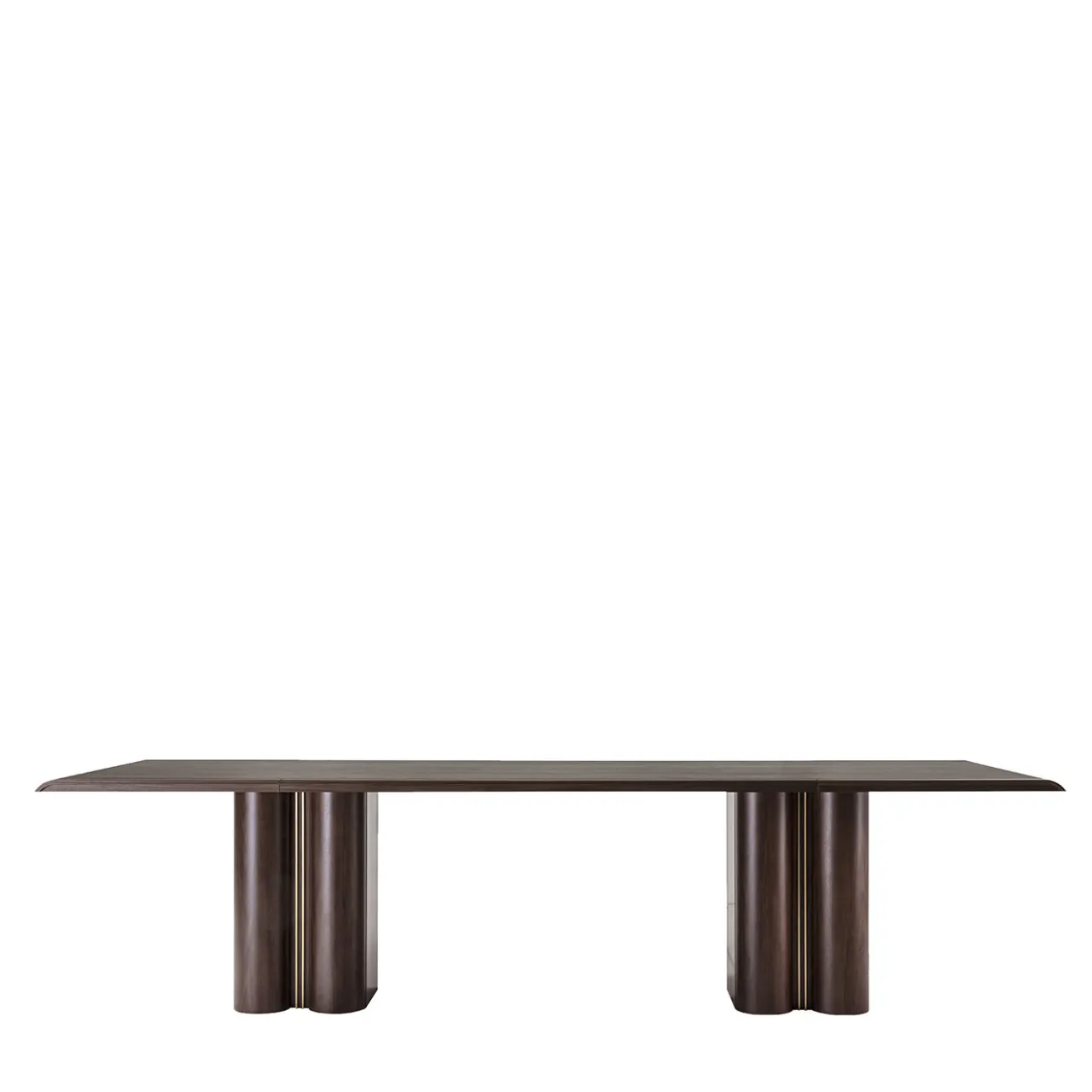 Splendide finiture e un tocco di modernità fanno di questo tavolo un’aggiunta superba a un ambiente contemporaneo sia interno che esterno. Rifinito in un’elegante tonalità tabacco opaco, questo tavolo è realizzato in noce massiccio e comprende due gambe scultoree – il cui profilo scanalato è accentuato da cuciture verticali in ottone satinato – che sostengono un piano d’appoggio rettangolare incredibilmente sottile. Consultate le varianti di design e le opzioni di personalizzazione con il Concierge.