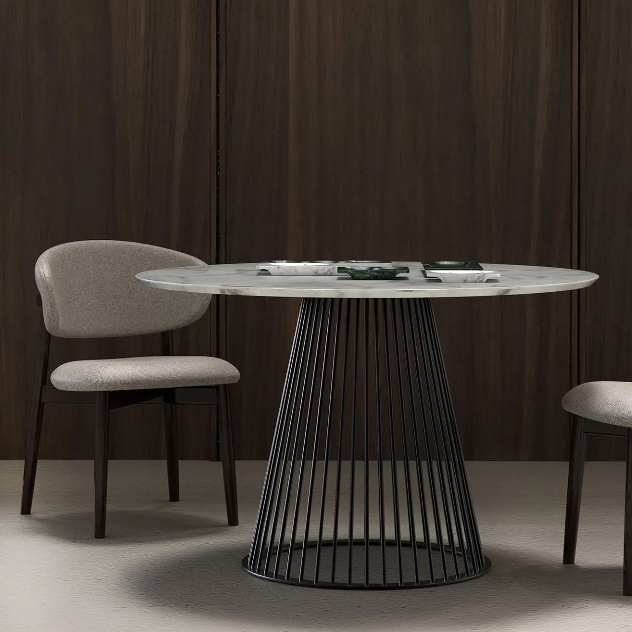 Torres è uno splendido tavolo da pranzo con base in metallo nero e piano in marmo bianco di Carrara. È disponibile anche come console o come set di tavoli; per l’intera collezione, consultare il catalogo Artemest.