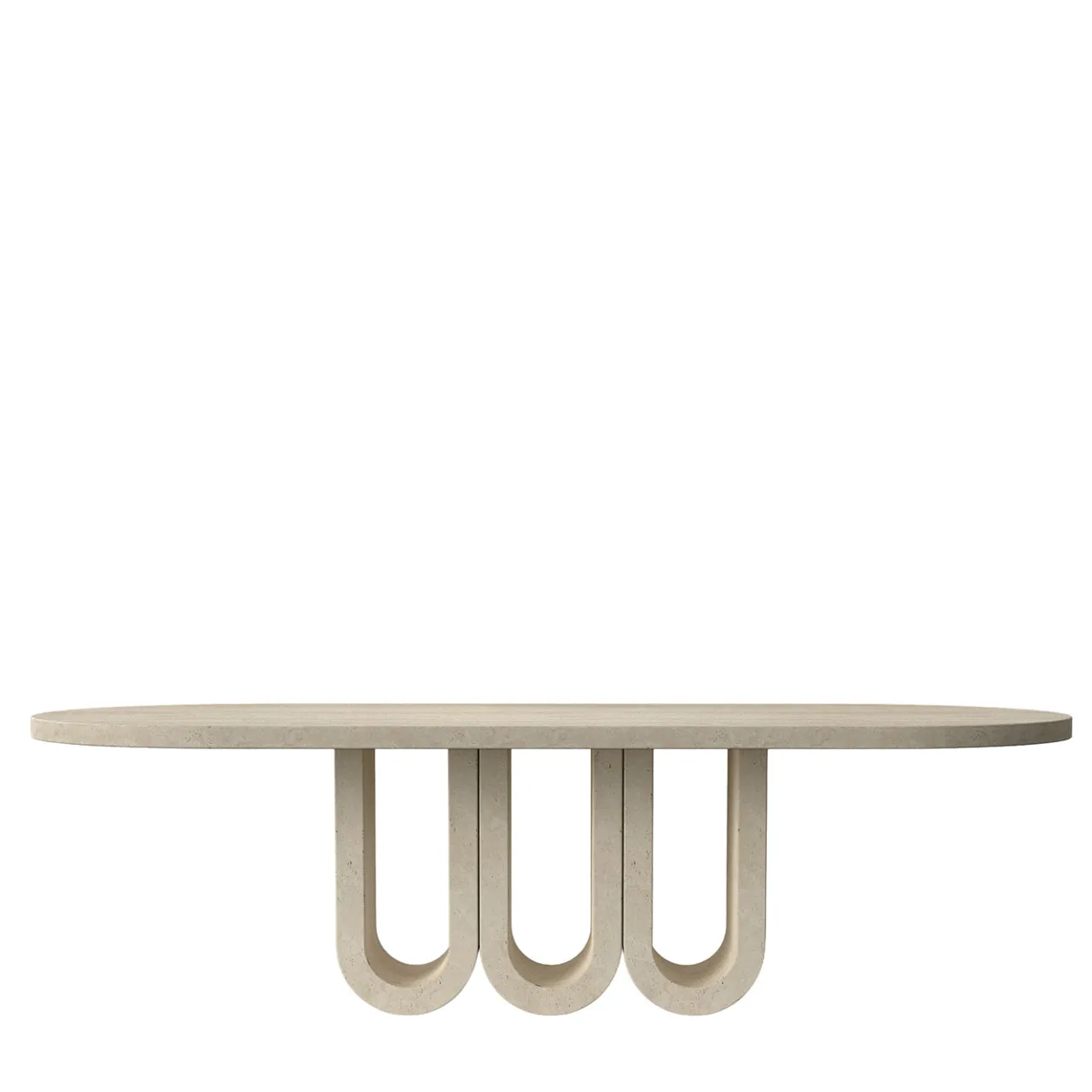 Il tavolo da pranzo Trifold presenta un piano ovale sorretto da una base scolpita da un unico blocco con un design a triplo arco ispirato all’architettura classica. La texture porosa e i caldi toni terrosi del travertino aggiungono profondità visiva e interesse tattile. Le sue proporzioni equilibrate e le curve raffinate fondono la solidità della pietra con una sensazione di leggerezza, combinando tecniche avanzate di lavorazione della pietra con un’arte esperta per offrire un pezzo scultoreo ma funzionale per la zona pranzo.
