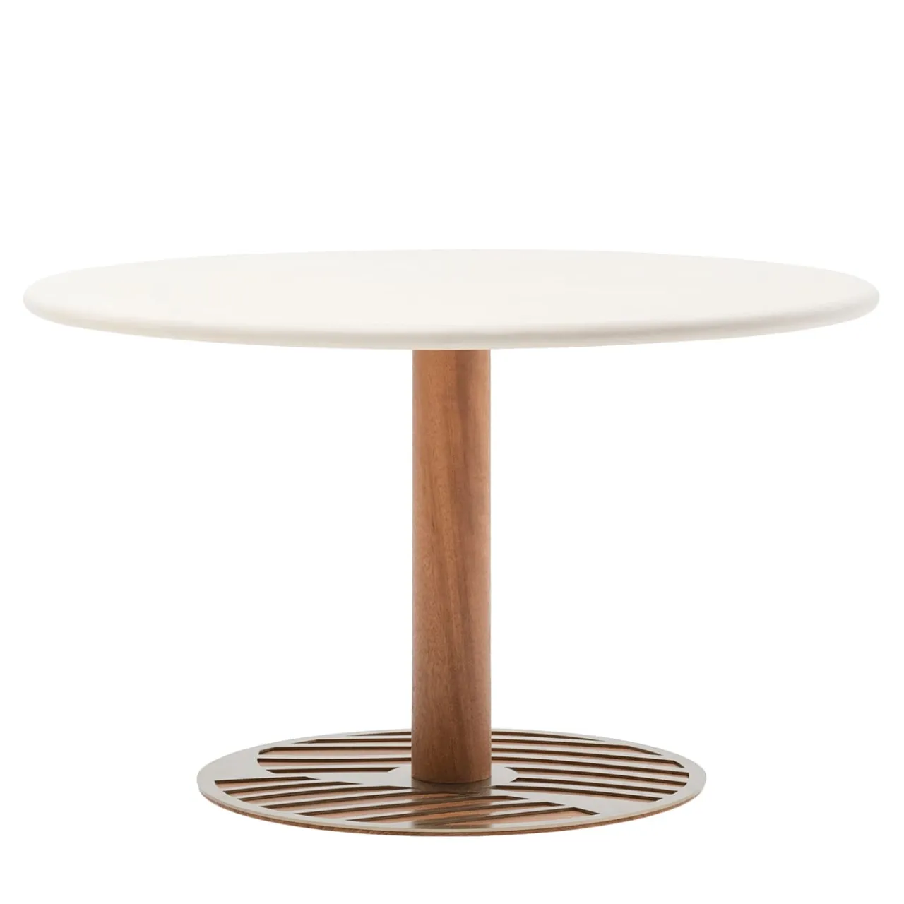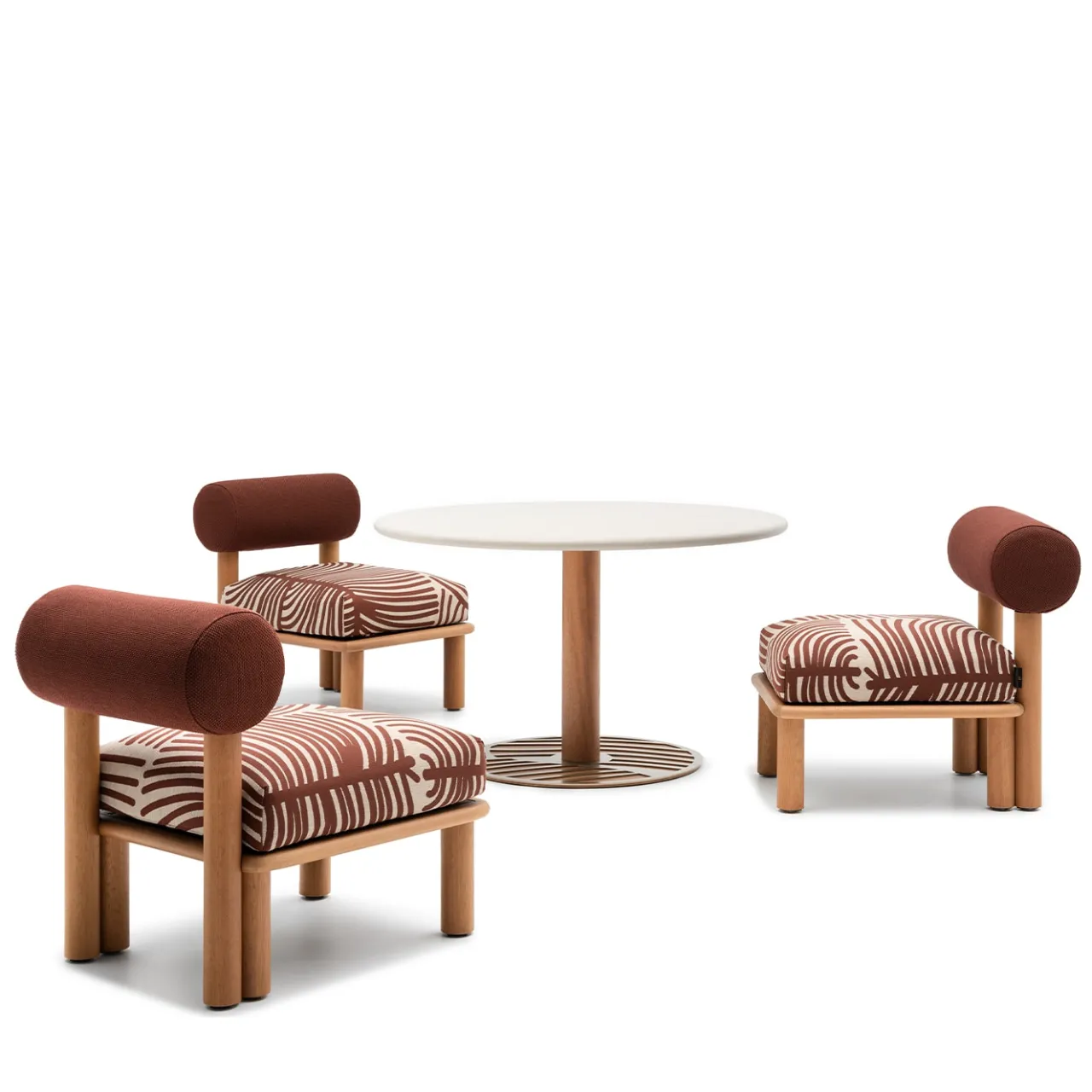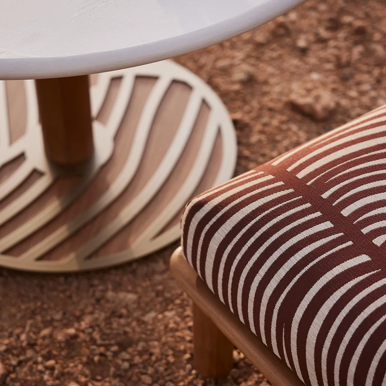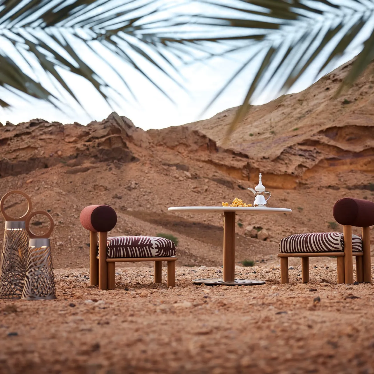 Ghaf, ispirato all’albero del deserto che simboleggia la tolleranza, è un tavolo lounge per esterni di Lorenza Bozzoli. Il design organico della sua base imita le radici dell’albero, emanando forza ed eleganza naturale. Il piano è in compensato marino di okumè rivestito con polimeri a base d’acqua, tra cui olio di girasole e inerti naturali, applicati manualmente da abili artigiani. La gamba del tavolo, in legno di iroko, è trattata con olio all’acqua per la protezione dai raggi UVA e l’uniformità del colore. La base presenta un motivo decorativo tagliato al laser.
