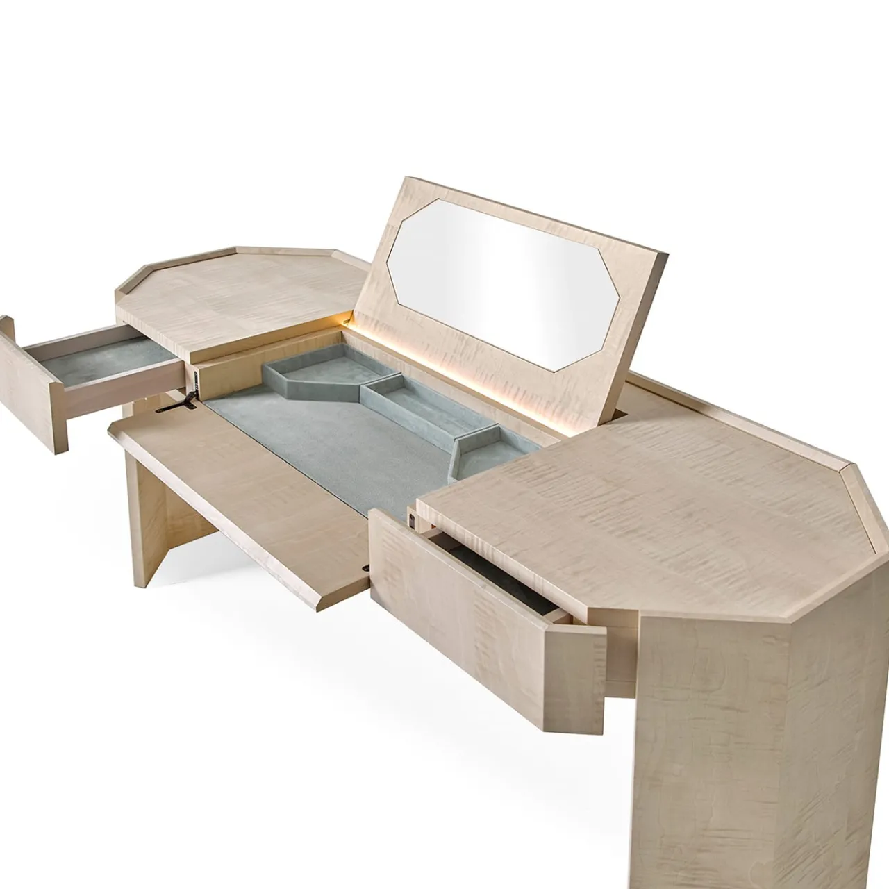 Tavolino da toilette dalla particolare forma a ottagono composto da due cassetti e un vano contenitore apribile. Rivestito in pregiata impiallacciatura di legno con finitura Fox opaca. Luci interne a led fornite come optional.