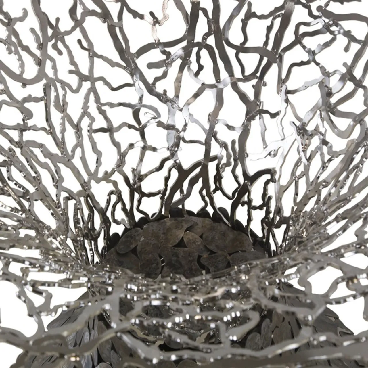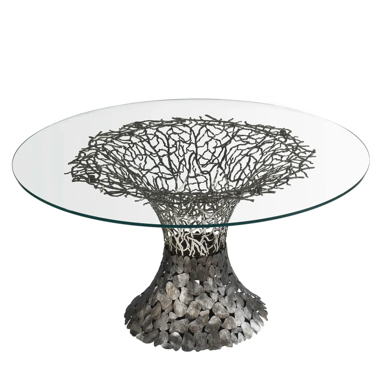 La maestria artigianale conferisce a questo tavolo una straordinaria miscela di eleganza moderna e bellezza naturale. La base, rifinita in corten argentato con rami in acciaio puro, sostiene un piano in vetro che mette in risalto l’intricata lavorazione del metallo sottostante. Questo tavolo combina perfettamente materiali raffinati e design artistico. Disponibile anche in altre finiture, per maggiori informazioni contattare il concierge.