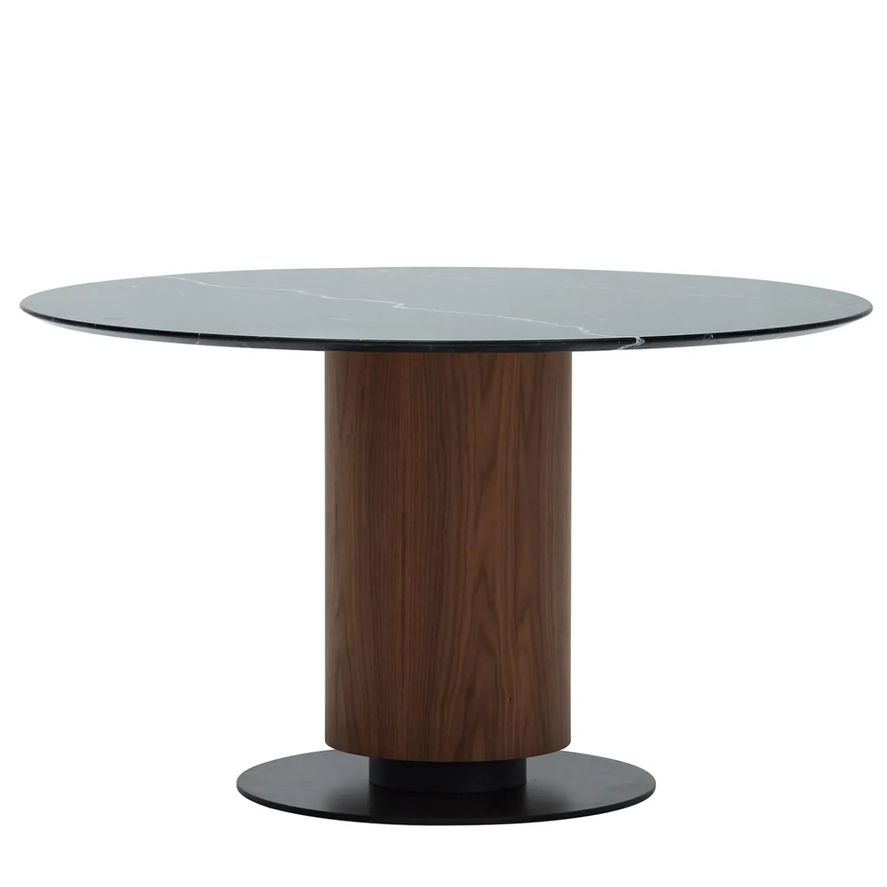 Celebrando l’arte dei materiali, questo tavolo è una testimonianza di artigianato senza tempo. La colonna in noce massiccio attira l’attenzione con la sua presenza robusta ma aggraziata, elegantemente sollevata da un’elegante base in metallo nero. A coronare questo capolavoro, un piano in marmo nero Marquinia dal diametro di 120 cm, che invita all’ammirazione per il suo sorprendente contrasto visivo. Ideale per chi apprezza l’armonia tra forma e funzione, questo tavolo promette di essere il fulcro di raffinate esperienze culinarie.