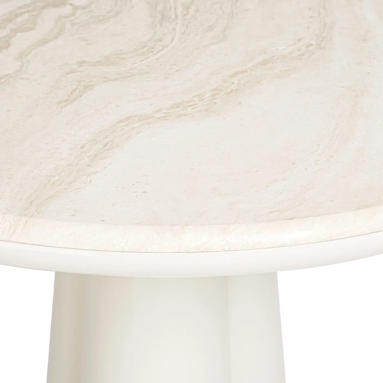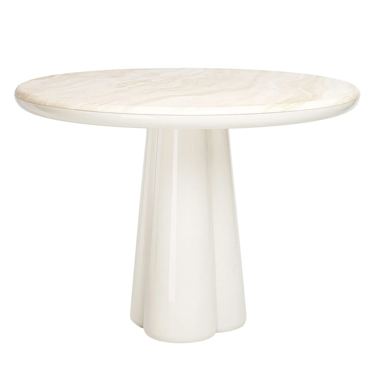 Un piano rotondo in marmo è abbinato a una base scultorea composta da tre supporti conici arrotondati che conferiscono al prodotto una forte tridimensionalità. Abbinato agli sgabelli Anodo, è ideale per creare un angolo raffinato e scultoreo. Fa parte della collezione New Atomic Age disegnata da Elena Salmistraro per Scapin Collezioni. La designer e artista Elena Salmistraro si ispira al periodo storico compreso tra gli anni Quaranta e gli anni Sessanta.