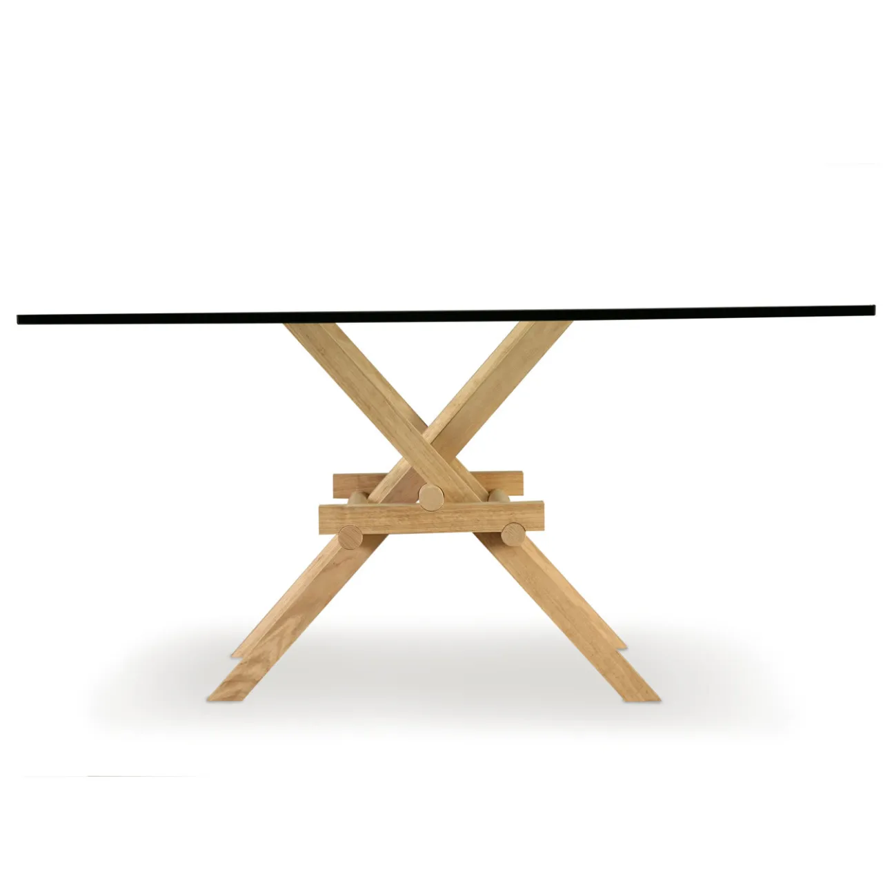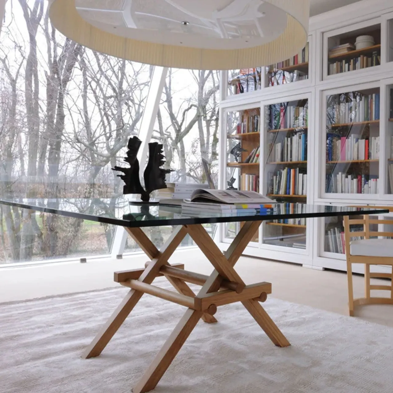 Marco Ferreri si è ispirato ai ponti mobili di Leonardo da Vinci per progettare questo tavolo da pranzo, caratterizzato da un sistema di gambe in massello di frassino collegate tra loro da una sapiente combinazione di incastri, che gli conferiscono la solidità necessaria a sostenere il piano sovrastante, che può essere in vetro (come in questo caso) o in frassino. Perfetto esempio di architettura applicata alla produzione di mobili, questo tavolo sarà un’elegante aggiunta a qualsiasi arredamento.