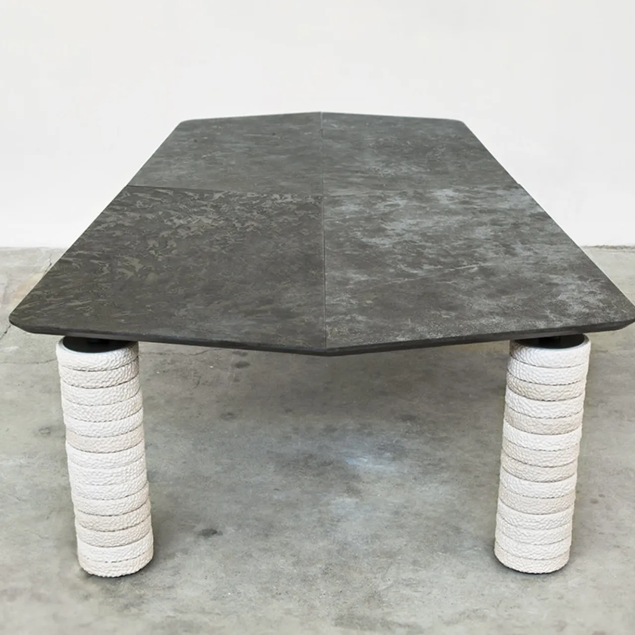 Maestoso e scultoreo, questo tavolo è stato progettato per stupire con i suoi audaci tratti di riferimento geometrico e le sue squisite caratteristiche naturali. Il piano in Bluestone, robusto e resistente all’acqua, è stato tagliato con la tecnica del getto d’acqua e poggia su quattro gambe cilindriche in gres, costituite da anelli accuratamente martellati. Sia all’interno che all’esterno, il tavolo è sicuramente al centro dell’attenzione.