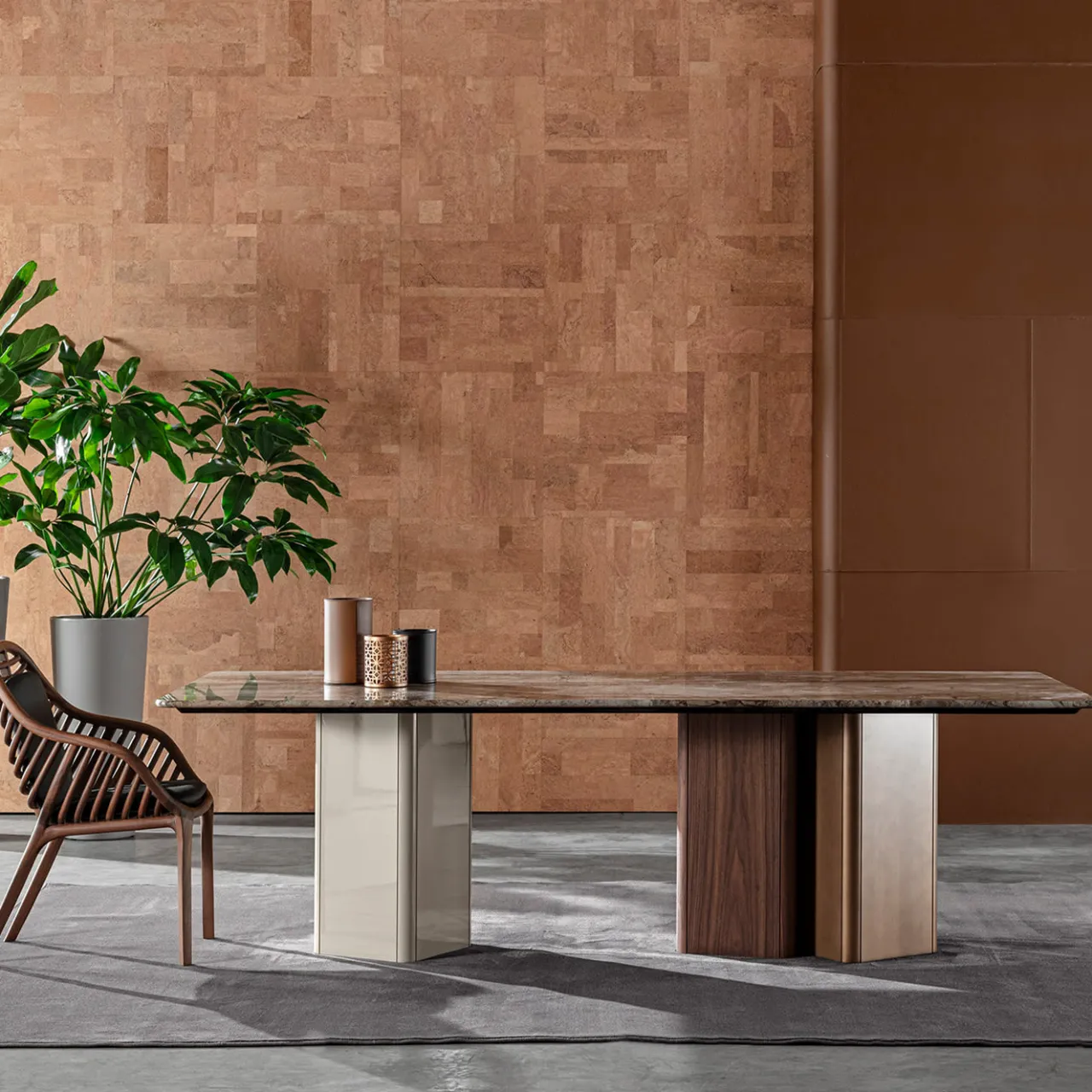 Magnifico esercizio di raffinatezza asimmetrica, questo tavolo è una straordinaria combinazione di materiali, finiture e volumi. Lo splendido piano in marmo Silver Roots è sostenuto da tre pilastri di forma diversa: uno in ottone chiaro satinato, uno con finitura laccata nera lucida e il terzo in noce canaletto con finitura opaca.