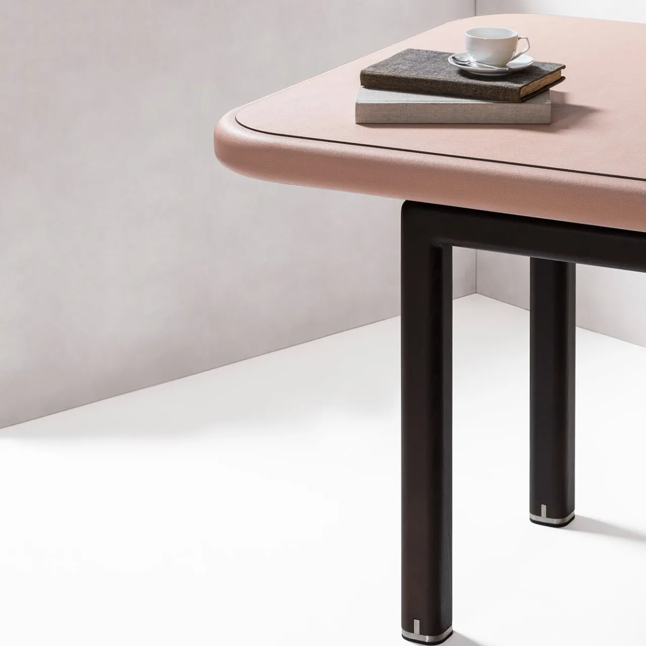 Realizzato in pelle e legno di noce canaletto tinto scuro. È dotato di piedini decorativi in acciaio inox. Misure personalizzate disponibili su richiesta.