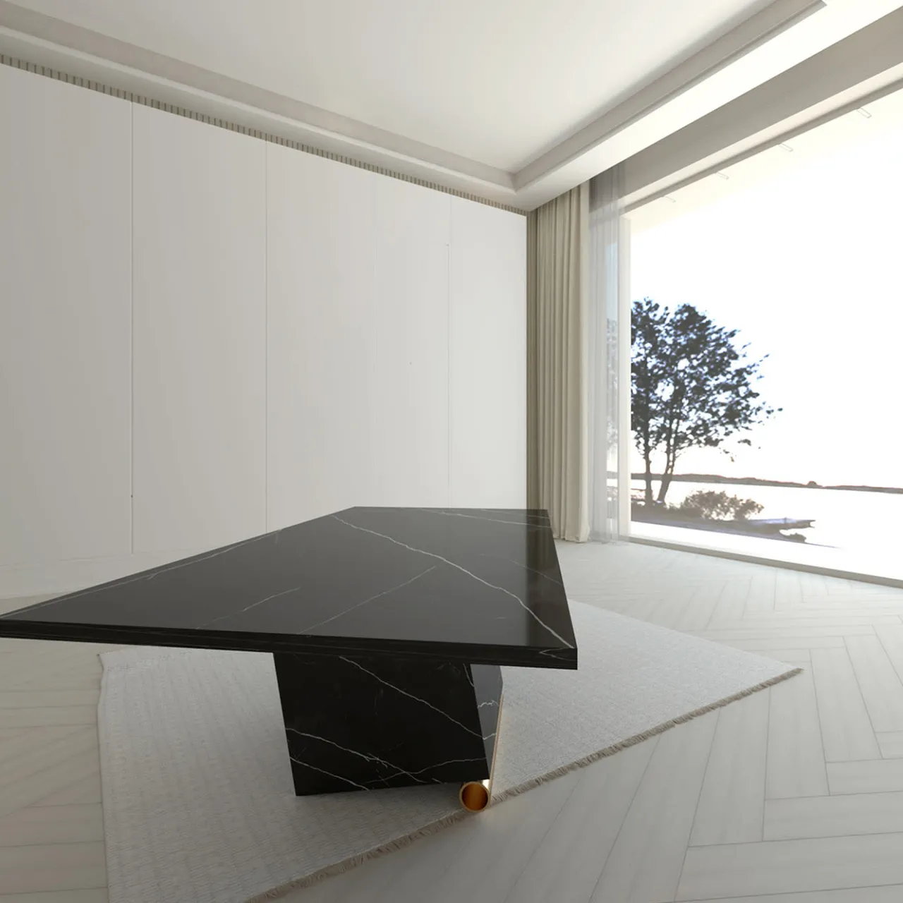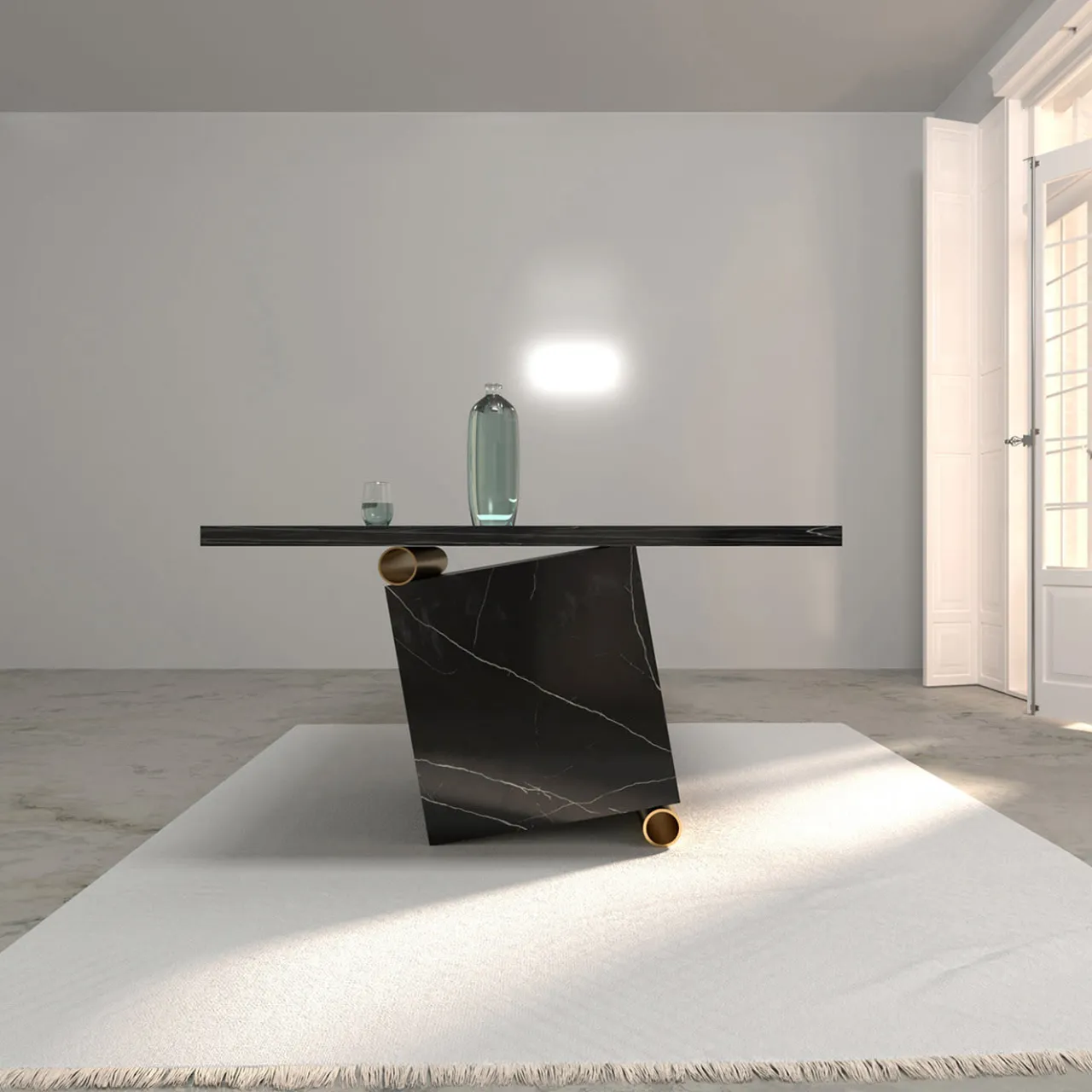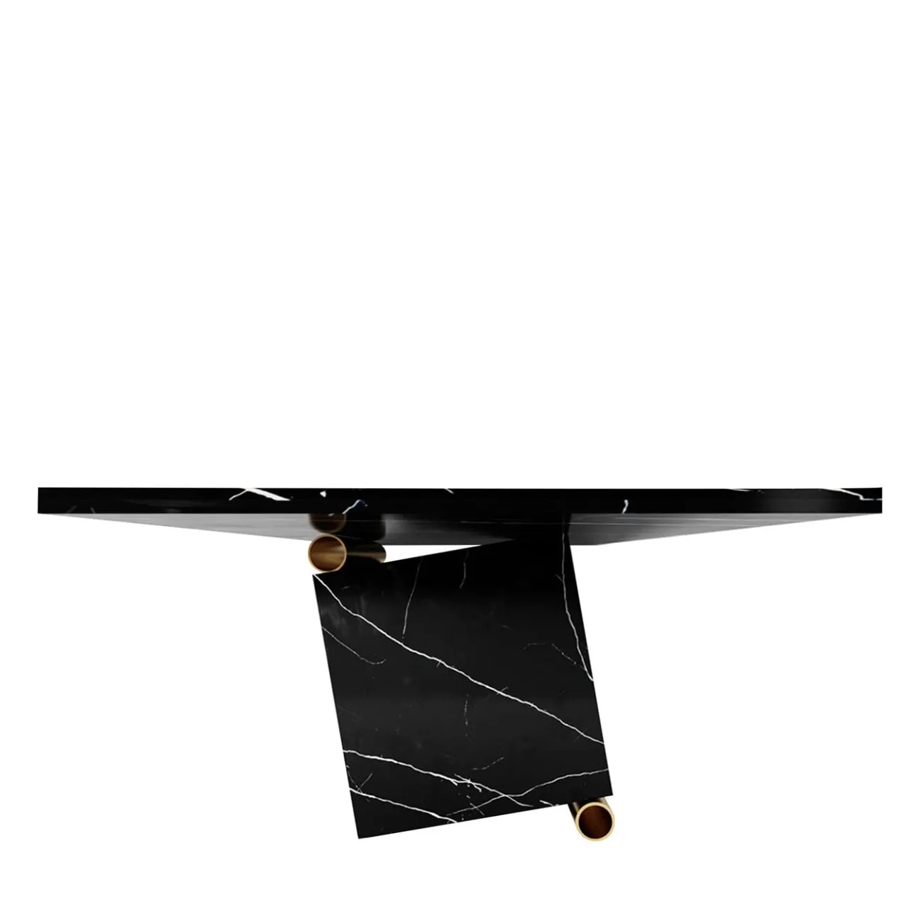 Questo iconico tavolo si distingue per un design stimolante, in cui lo spesso piano poggia su un blocco coordinato accentuato da tubi in ottone che creano l’illusione che scivoli e si muova. I volumi minimalisti sono realizzati in pregiato marmo Marquinia, una pietra preziosa la cui tonalità nera profonda è interrotta solo da dinamiche traccie e inclusioni di colore bianco brillante.